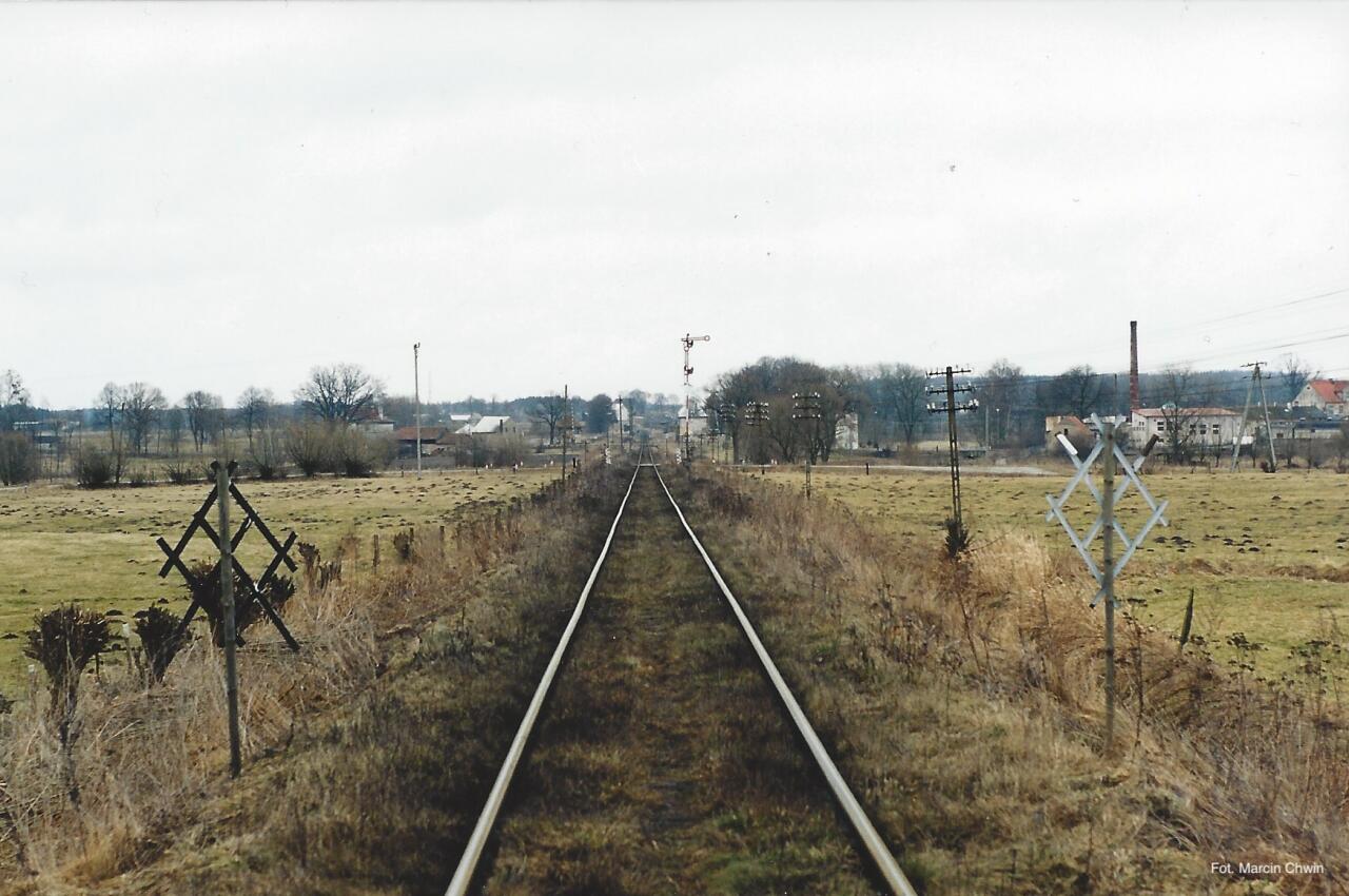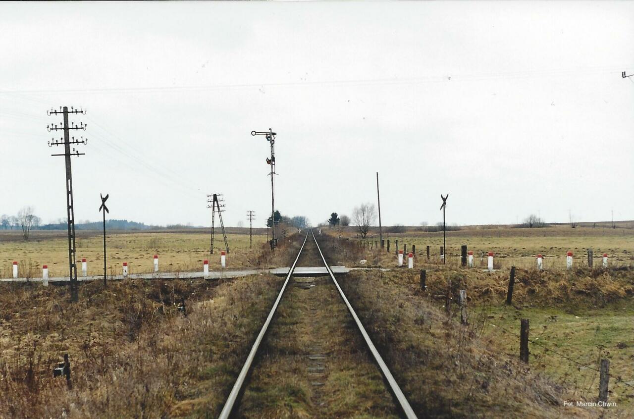 Nieistniejący semafor wjazdowy na stację Biała k. Piszu (Biała Piska) od strony Kaliszek (Pisza), w oddali widoczny przejazd strzeżony, komin nieistniejącej mleczarni i sama stacja.