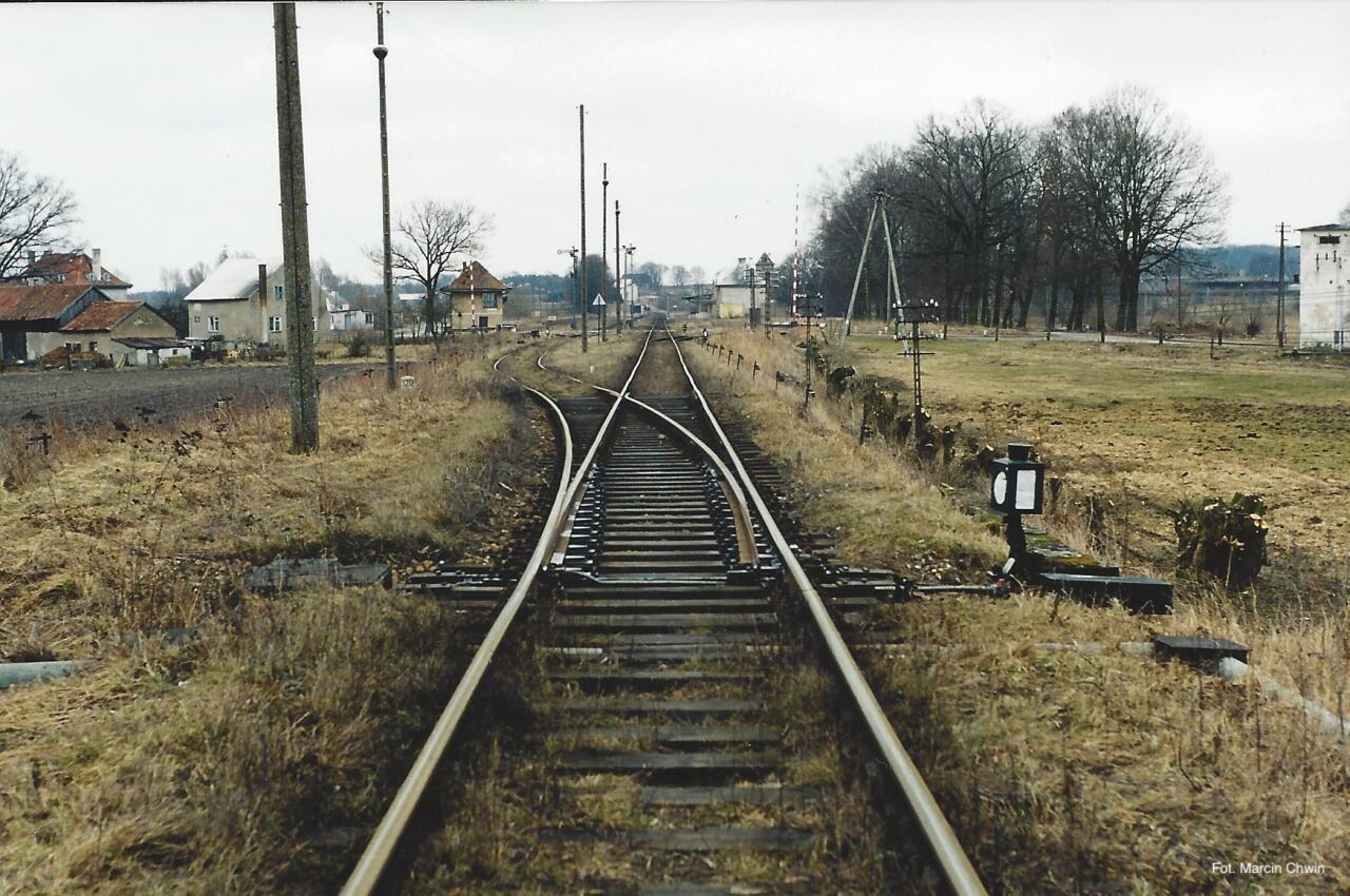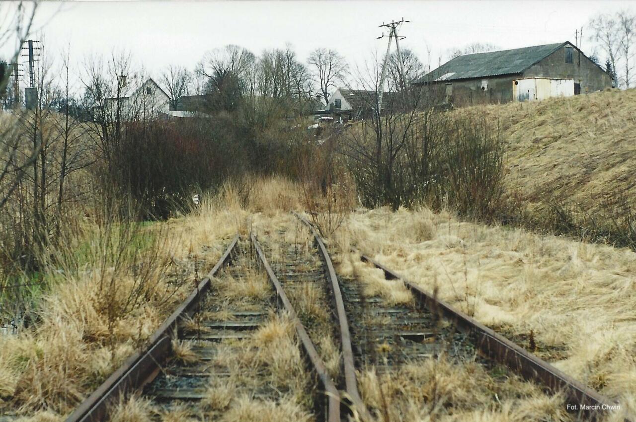 Stacja Biała k. Piszu (Biała Piska), końcówka punktu zdawczo-odbiorczego bocznic do Agromy (?) i elewatora, w wykopie obok znajdującego się poza zdjęciem po lewej stronie wyjazdu ze stacji w stronę Drygał (Ełku).