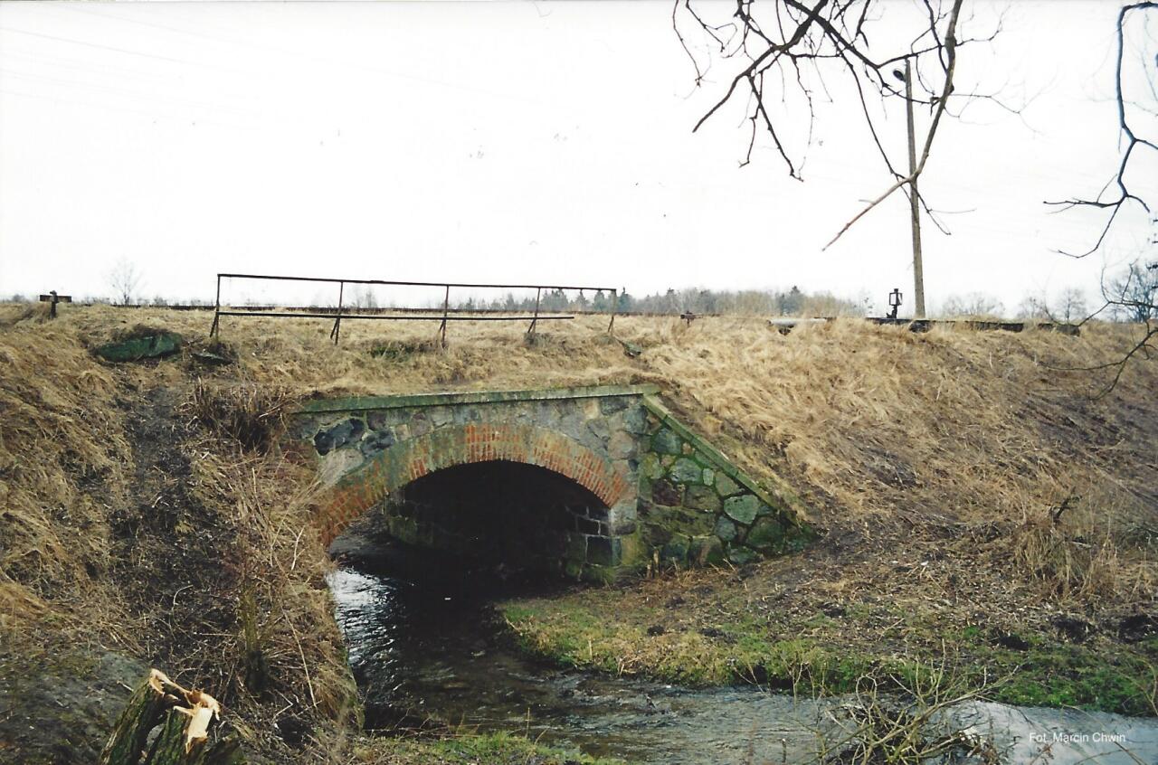 Most kolejowy nad rzeką (rzeczką) Białką, początek równi stacyjnej stacji Biała k. Piszu (Biała Piska) od strony Kaliszek (Pisza). Tuż za mostem na nasypie widoczne pierwsza zwrotnica i pierwsza lampa oświetlająca wjazd na stację.