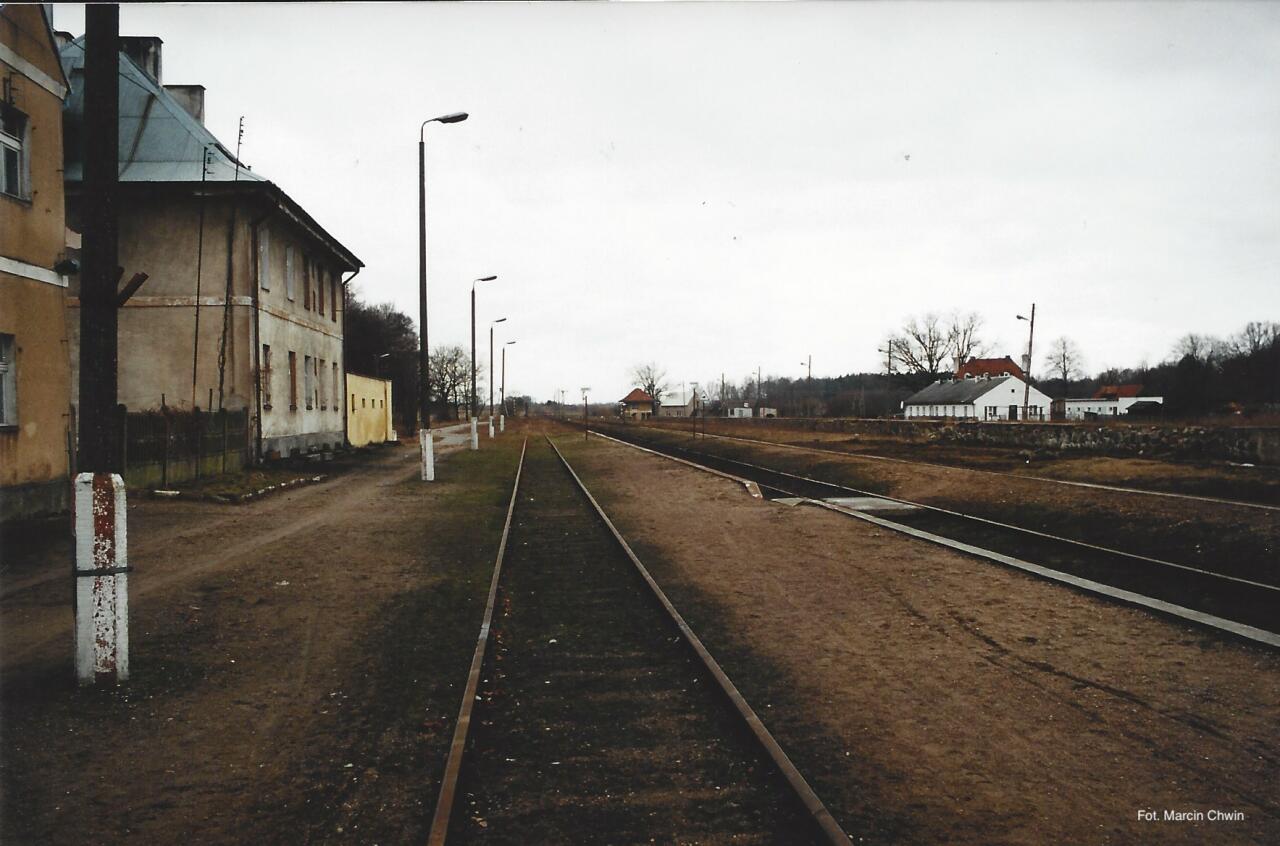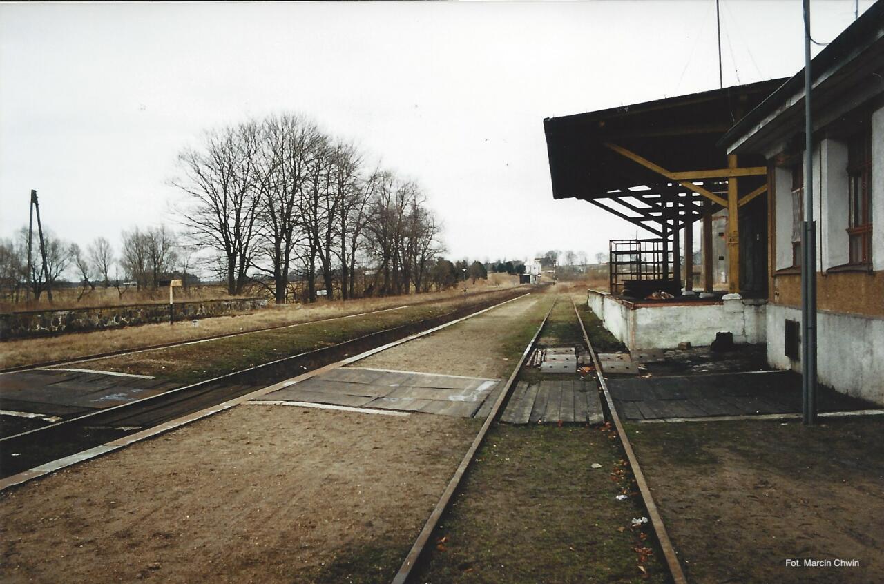 Stacja Biała k. Piszu (Biała Piska), spojrzenie po wyjściu z budynku dworca (poczekalnia, kasy, wejście na dworzec z miasta) na perony w kierunku Kaliszek (Pisza).