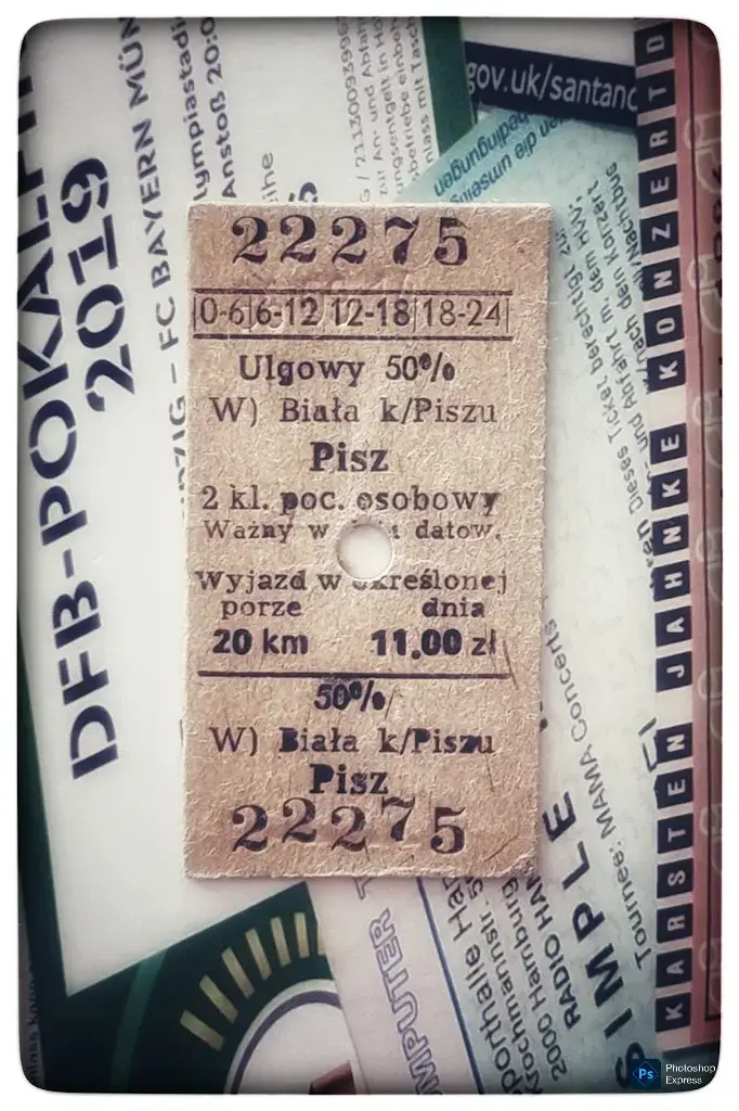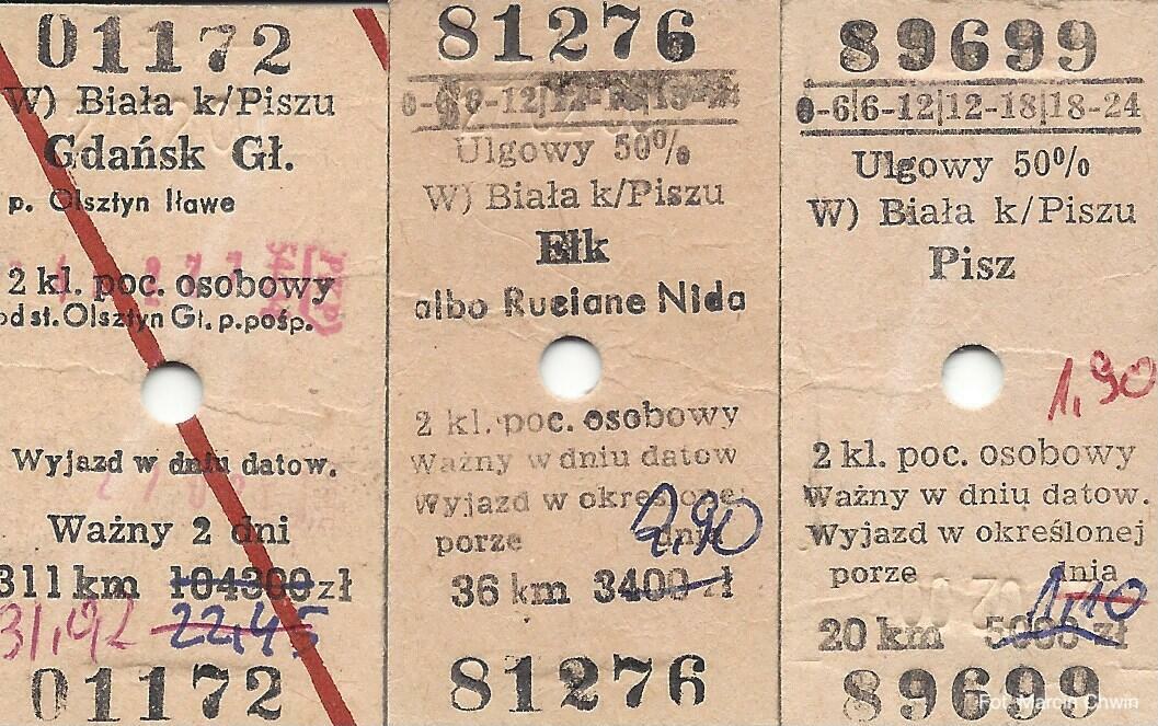Kartonikowe bilety wydane przez kasę biletową na stacji Biała k. Piszu (Biała Piska). Bilety zakupione na krótko przed demontażem datownika, jedne z ostatnich (o ile nie ostatnie)…