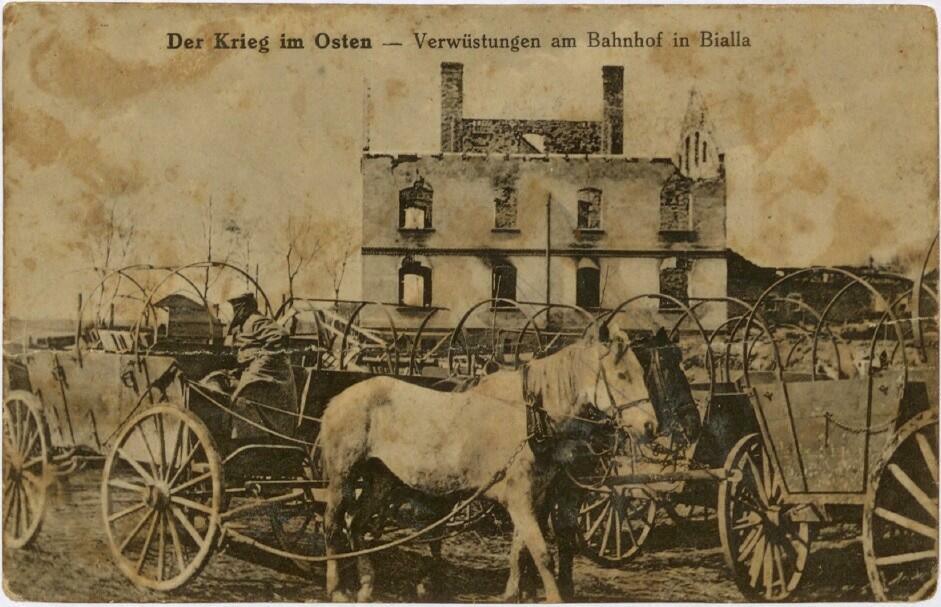 Zniszczony w wyniku działań wojennych budynek dworca w Białej.