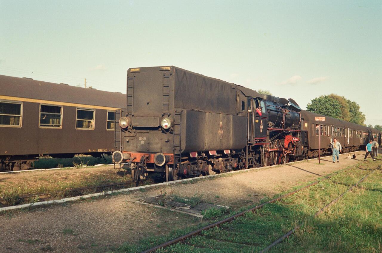 Stacja Biała koło Piszu - pociąg M 15820 relacji Ełk - Szczytno, prowadzony parowozem Ol49-18 (MD Ełk) w oczekiwaniu na odjazd. Widok w kierunku stacji Ełk.