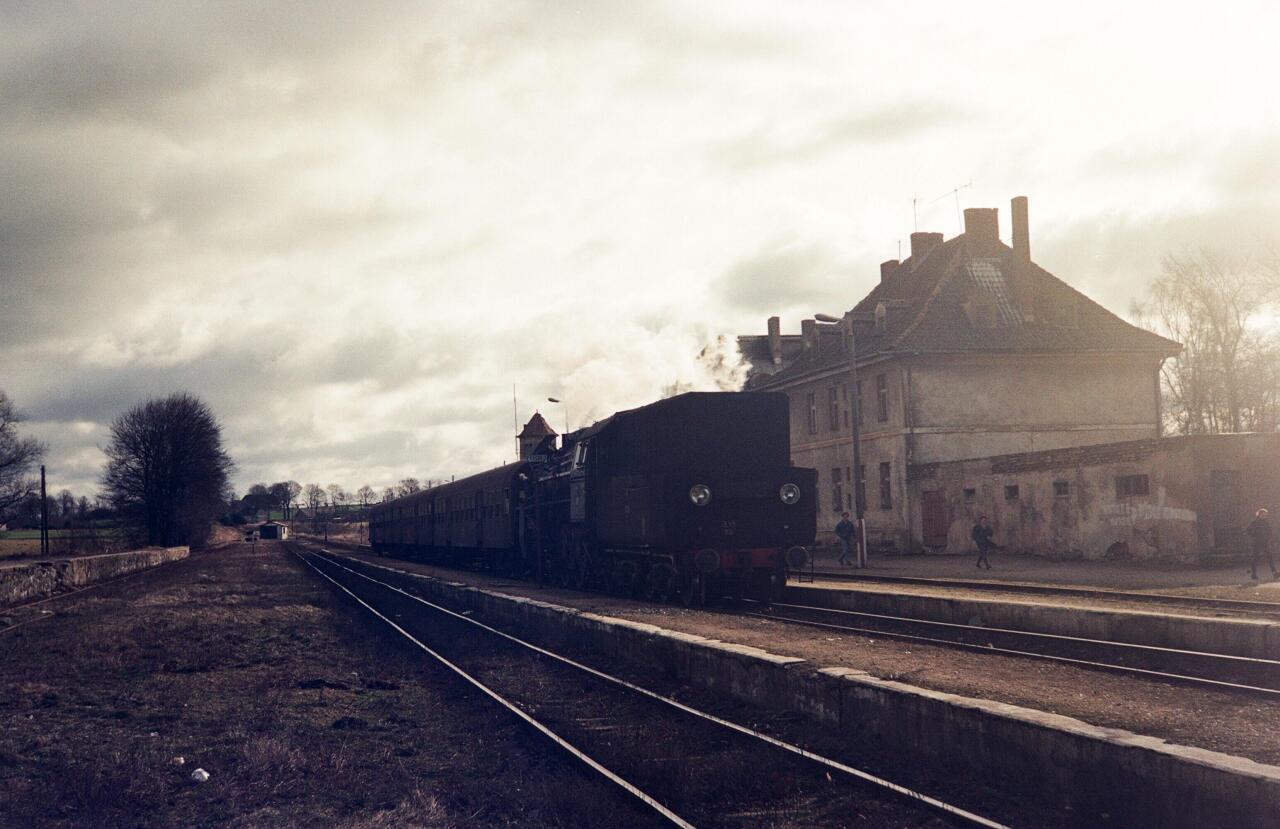 Stacja Biała koło Piszu - magazyn towarowy, budynek stacyjny, z prawej rampa ładownicza boczna, pociąg M 9633 relacji Ruciane Nida - Ełk, prowadzony parowozem Ol48-80 (MD Ełk). Widok w kierunku stacji Szczytno (Olsztyn Główny).