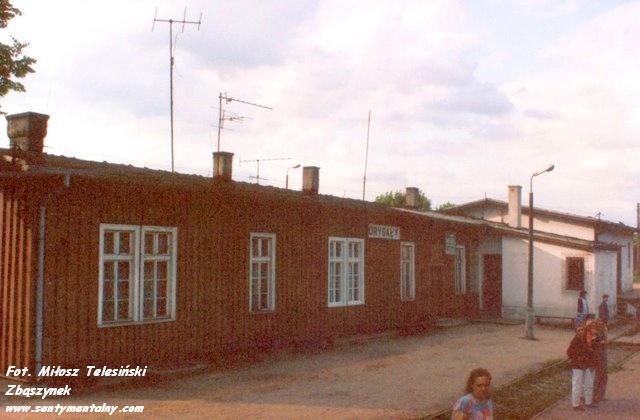 Dworzec zabity dechami na podróżnych. Widok od strony peronu; w lewo Pisz, w prawo Ełk.