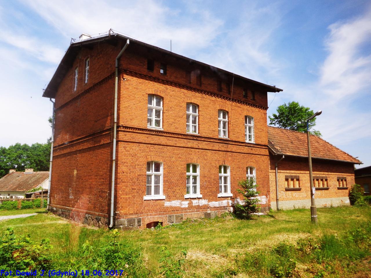 Kolejowy budynek mieszkalny z przyległą częścią z pomieszczeniami WC, widoczny od strony torów. W lewo Pisz/Olsztyn Główny, w prawo Ełk.