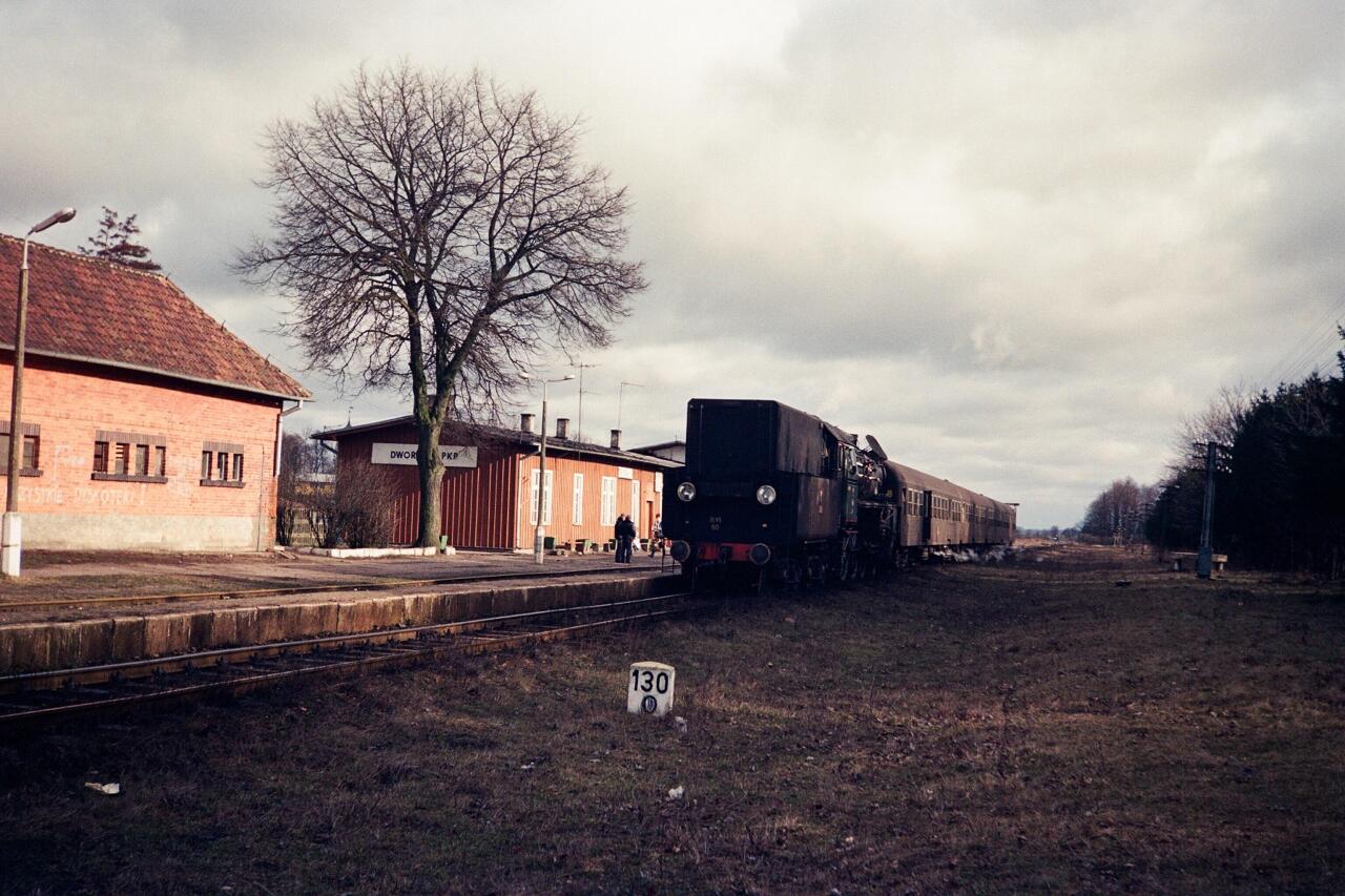 Stacja handlowa Drygały - budynek stacyjny, budynki towarzyszące, słupek hektometrowy: km 130,0 linii nr 219 Olsztyn Główny - Ełk. Pociąg M 9634 relacji Ełk - Ruciane Nida, prowadzony parowozem Ol49-80.