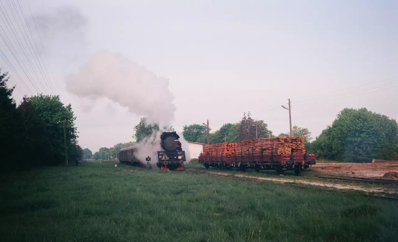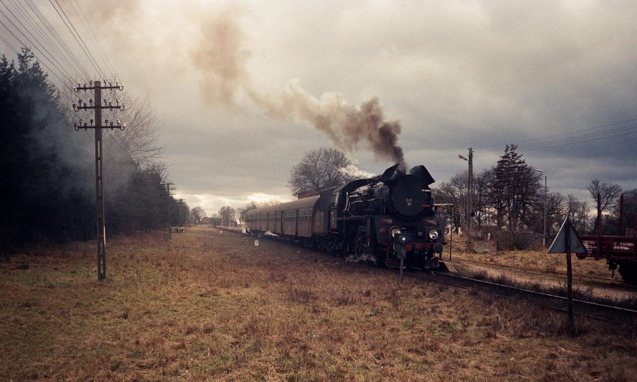 Stacja handlowa Drygały - plac ładunkowy (z prawej), pociąg M 9631 relacji Pisz - Ełk, prowadzony parowozem Ol49-11 (MD Ełk), widok w kierunku stacji Szczytno (Olsztyn Główny).