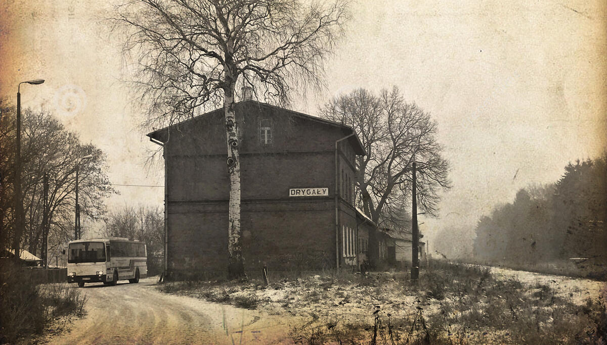 W lewym, dolnym polu budynek dworca w Drygałach. Widok od strony peronu; w lewo Pisz, w prawo Ełk.