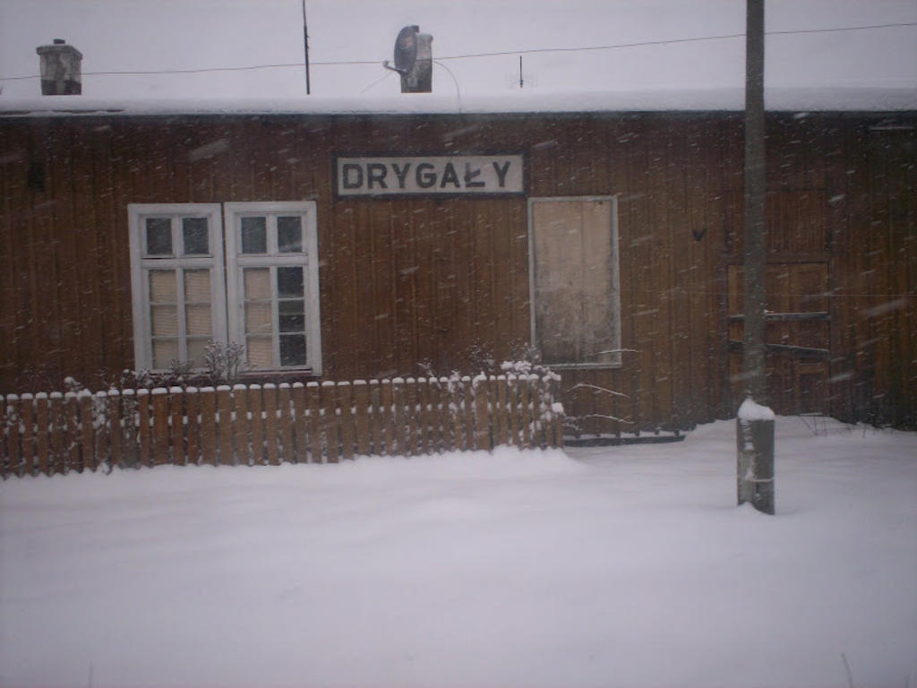 Przed modernizacją jeden peron z jedną krawędzią. Dwa tory: główny i boczny, z czego ten drugi nienadający się do eksploatacji. Za torem głównym równia, szeroka na kilkanaście metrów i długa na kilkadziesiąt. Może wskazywać, że kiedyś istniały tam dodatkowe tory. Szeroki nasyp i oddalone słupy telegraficzne, mogą wskazywać obecność nawet dwóch torów, jednak innych śladów potwierdzających tą tezę nie ma. Po modernizacji z lat 2018-2019 przystanek i mijanka. Obsługa miejscowa i/lub z LCS Szczytno. Opis budynków: "Dworzec PKP". Tablica z takim napisem wisi na bocznej ścianie budynku położonego przy ulicy Kolejowej 7 w Drygałach. Stacja ta ma zdecydoanie najlepiej zachowany obiekt tego typu na linii Pisz - Ełk. Parterowy budynek z zewnątrz obity rudymi deskami to w rzeczywistości obiekt murowany. Dobrze zabezpieczone drzwi i okna, a także fakt, że obok mieszkają ludzi sprawiły, że obiekt zarówno na zewnątrz jak i w środku jest w dobrym stanie. W poczekalni, drzwi do kasy z napisem treści: "Kasa bilet.-bagaż. Nieupoważnionym…" Schludne ściany z zieloną lamperią sprawiają wrażenie jakby zostały wczoraj pomalowane. A przecież budynek zamknięto w 2000 roku. W innym pomieszczeniu dobrze zachowany zabytkowy fizyczny piec. Wyjście na peron zamurowane. Do budynku przylega magazyn. Tuż obok toaleta, a za nią blok mieszkalny. Budynki widnieją w gminnej ewidencji zabytków. |