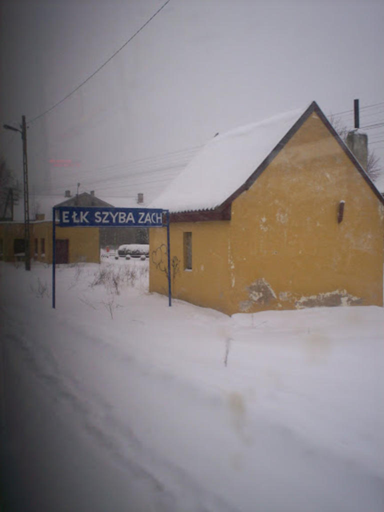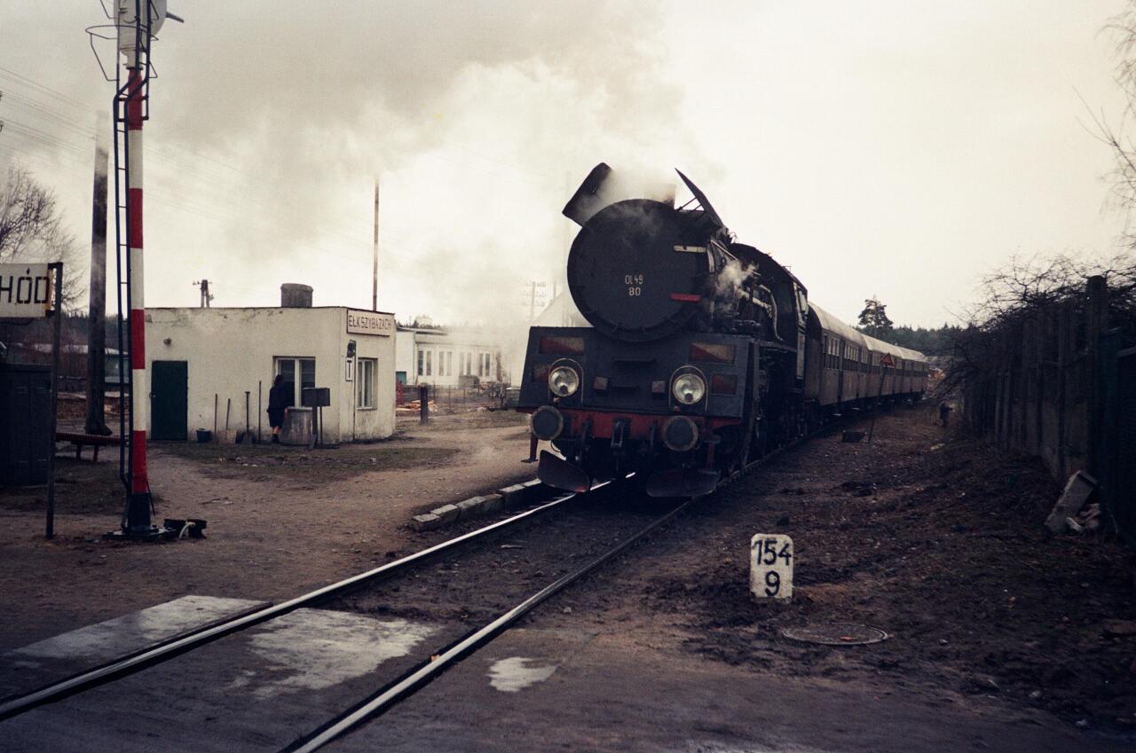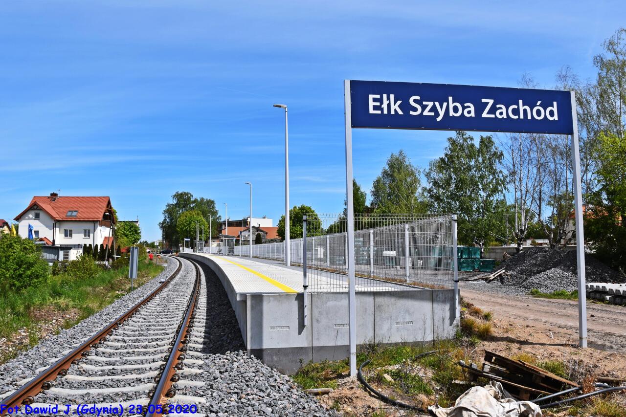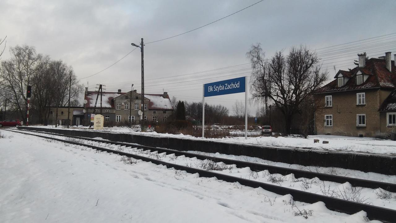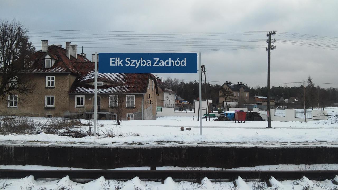 Przystanek osobowy Ełk Szyba Zachód - strażnica przejazdu kolejowego z drogą lokalną Ełk - Tama, widoczny słupek hektometrowy - km 154,9 linii nr 219 Olsztyn Główny - Ełk, pociąg M 9633 relacji Ruciane Nida - Ełk, prowadzony parowozem Ol49-80 (MD Ełk). Widok w kierunku stacji Szczytno (Olsztyn Główny).