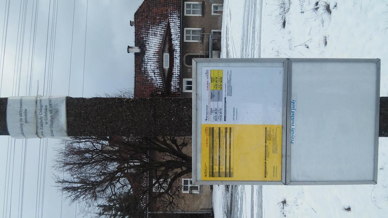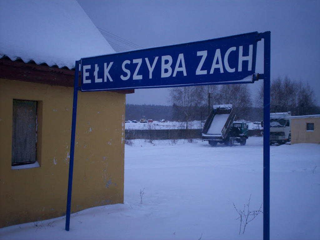 Wymieniona tablica. Na drugim planie bystre oko dostrzeże budynek i tablicę przystanku Ełk Szyba Wschód..