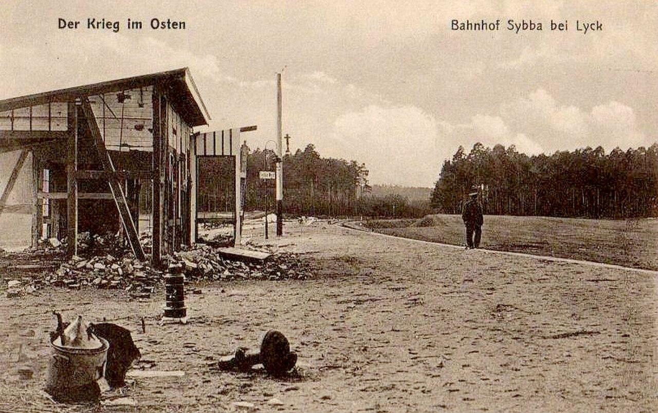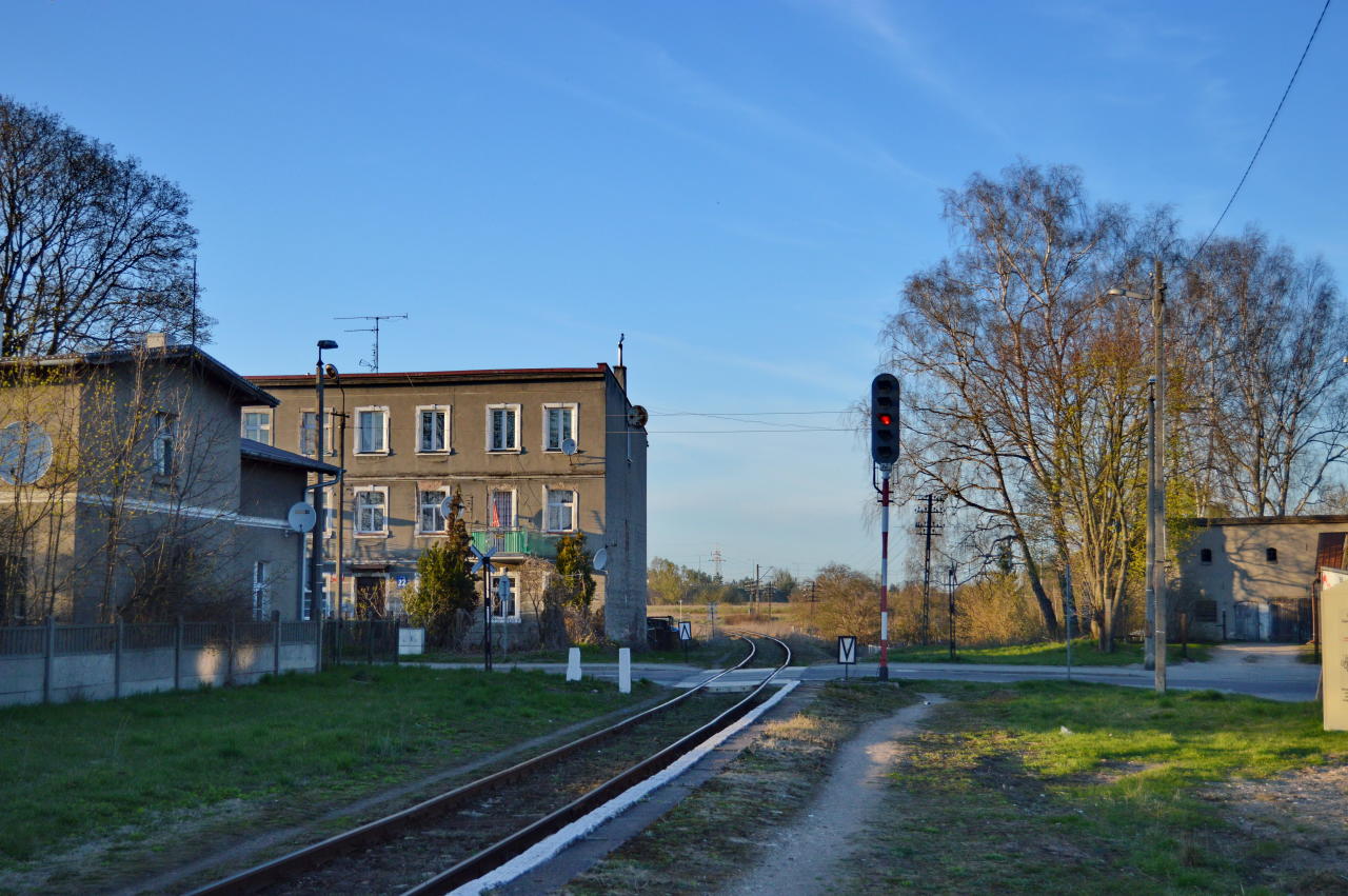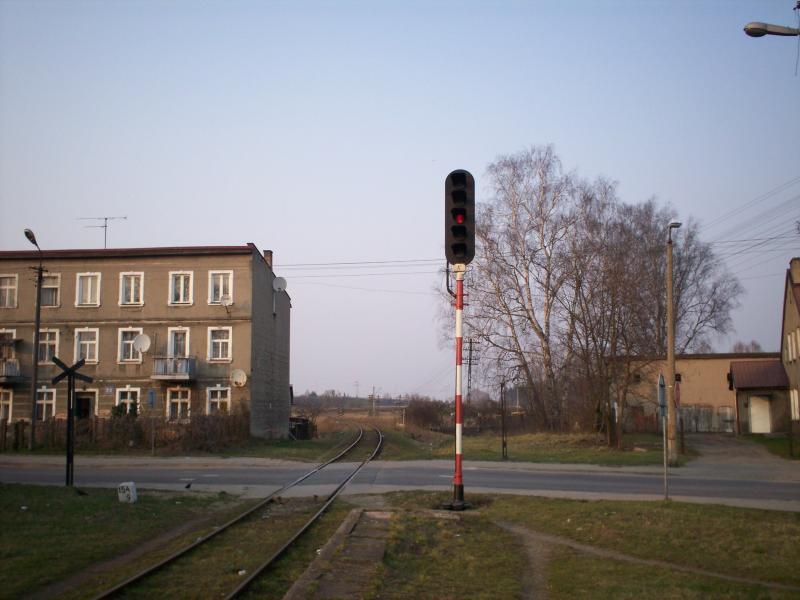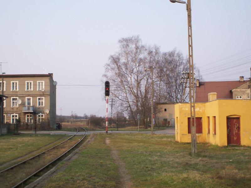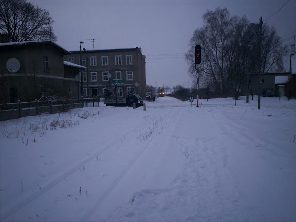 Zdewastowany budynek stacyjny z prawej oraz jedyny semafor świetlny na odcinku z Piszu do Ełku.