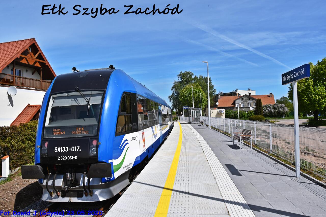 Widok z peronu w kierunku Ełku (stacji kolejowej). Tablica z nazwą przystanku osobowego. Pociąg SA133-017 realizujący kurs PR z Olsztyna Głównego do Ełku p. Pisz, oczekuje przy peronie.
