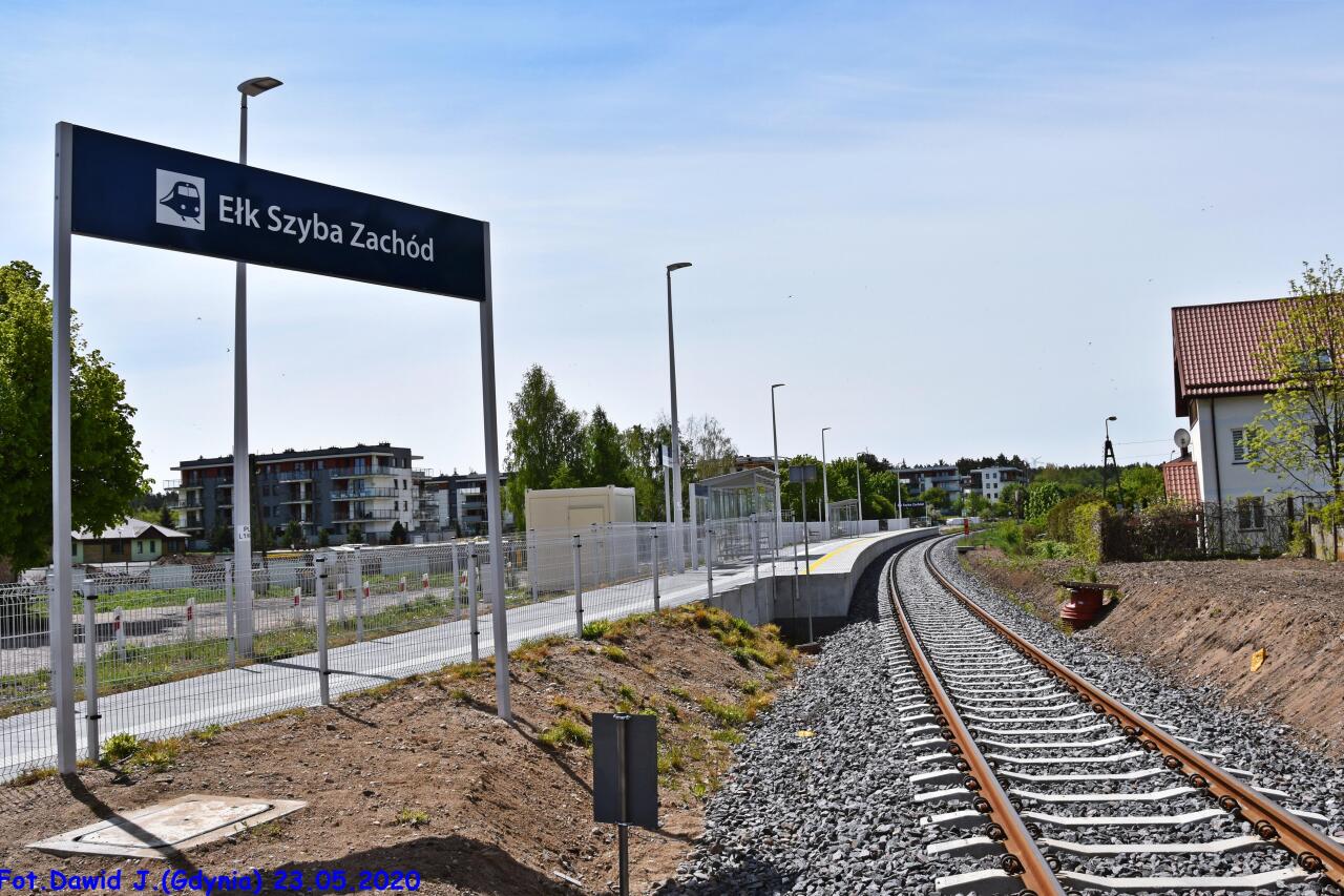 Widok z okien pociągu 9623 na peron przystanku osobowego Ełk Szyba Zachód.