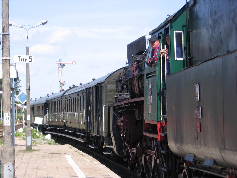 Zadowolony maszynista wjeżdża na dworzec w Kościerzynie.