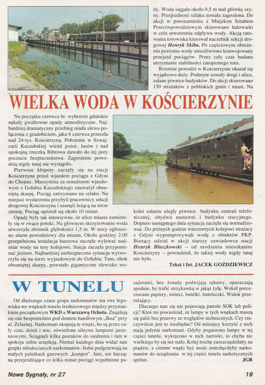 Skan artykułu z Nowych Sygnałów nr 27/98 o podtopieniu stacji w Kościerzynie oraz niechcianych gościach w tunelu średnicowym w Warszawie.