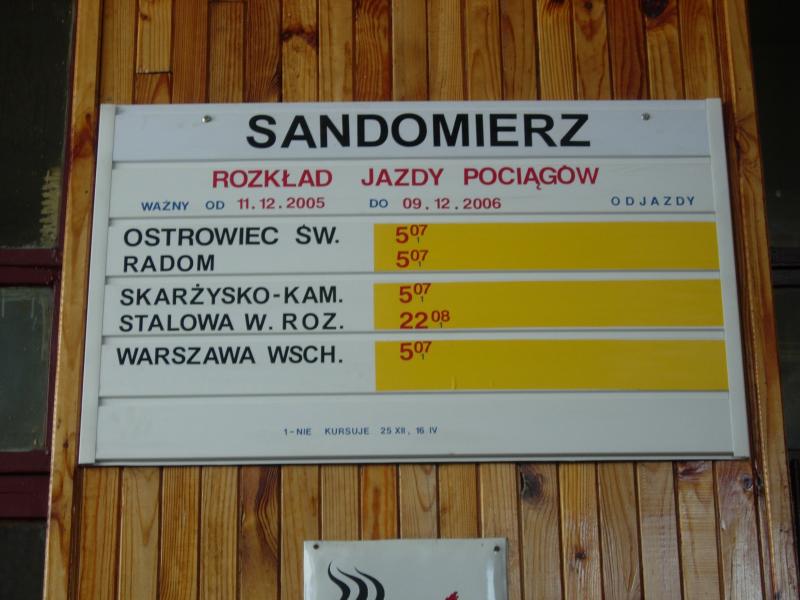 Do 1915 roku stacja końcowa linii z Dębicy. Dziś budynek stacyjny świeci pustkami. Są 3 kasy biletowe (bądź 2 kasy i informacja). Przy stacji stoi nawet zadbana wieża wodna. Jeżdżą pociągi z Warszawy Zachodniej do Przemyśla, z Warszawy Wschodniej do Zagórza… Kiedyś jeździł pociąg do Skarżyska, który zatrzymywał się na pobliskich stacjach. Teraz już nie kursuje i dlatego pobliskie stacje zostały zamknięte. Od stacji uchodzi czynna bocznica do Huty szkła w Sandomierzu. (info: Bartek Jaszczur, 2005-08-27) Obecnie kolej pasażerska w Sandomierzu stopniowo wymiera. Jedynym pociągiem pospiesznym, który przejeżdża przez Sandomierz jest Sienkiewicz z Rozwadowa przez Tarnobrzeg do Skarżyska Kamiennej (jest to łącznik do pociągu Kielce - Warszawa Wschodnia). W poprzednim rozkładzie (2004/2005) przez Sandomierz przejeżdżały San i Wetlina (aktualnie zostały przetrasowane). W rozkładzie 2003/2004 było kilka par osobówek do Skarżyska, Rozwadowa, Rudnika, Przeworska, no i co jasne pociągi pospieszne m.in. Solina, która dziś jeździ przez Lublin. Na stacji ciągle odbywa się ruch towarowy. Pociągi towarowe ciągnięte zwykle ET22 jeżdżą głównie do Skarżyska-Kamiennej, Stalowej Woli, Tomaszowa Mazowieckiego. Oprócz tego praktycznie co dzień po stacji manewrują SM42 (CM Lublin), które dowożą sodę (w wagonach zbiornikowych) do huty szkła, po około 2 km bocznicy. Oprócz tego czynna jest bocznica do wytwórni pasz - firmy Dossche, do której stonki dowożą słowackie wagony. Kilka razy w miesiącu (głównie późnym wieczorem lub nocą) do huty szkła wjeżdżają dwie spięte ze sobą lokomotywy z ZIK (TEM2 i SM42) i tam manewrują zwykle dobę. Budynek dworca jest zdewastowany z zewnątrz jak również w środku. Kasa biletowa została zamknięta 20 października 2004 r., poczekalnie również zamknięto kilka dni później i wystawiono do wynajęcia. W budynku do niedawna czynna była nawet kwiaciarnia. Ostatnie prace remontowe na stacji miały miejsce w 30 i 31 sierpnia 2005 r., kiedy to odmalowano dolne części wiat przystankowych oraz część barierek. Oprócz tego część wybitych szyb w budynku dworca wymieniono na blachy. (info: Paweł Bryła, 2006-02-19) Poczekalnia czynna od 5:30- 18:00 (info: Bartek Jaszczur, 2006-08-27) Obecnie przez stację przejeżdża jedynie TLK „Brückner” Warszawa Zachodnia – Przemyśl Główny (ruch tylko weekendowy, piątki i niedziele po jednym kursie). Od 25 czerwca do końca sierpnia 2016 kursować będą weekendowe pociągi regio spółki Przewozy Regionalne relacji Kielce–Sandomierz. Władze wojewódzkie nie wykluczają kontynuacji tego połączenia po wakacjach. Połączenie będzie objęte promocją Bilet Świętokrzyski. Przejazd będzie trwał w jedną stronę 2,5 h, w powrotną 2 h. (info: Karol Szapsza, 2016-05-26). |