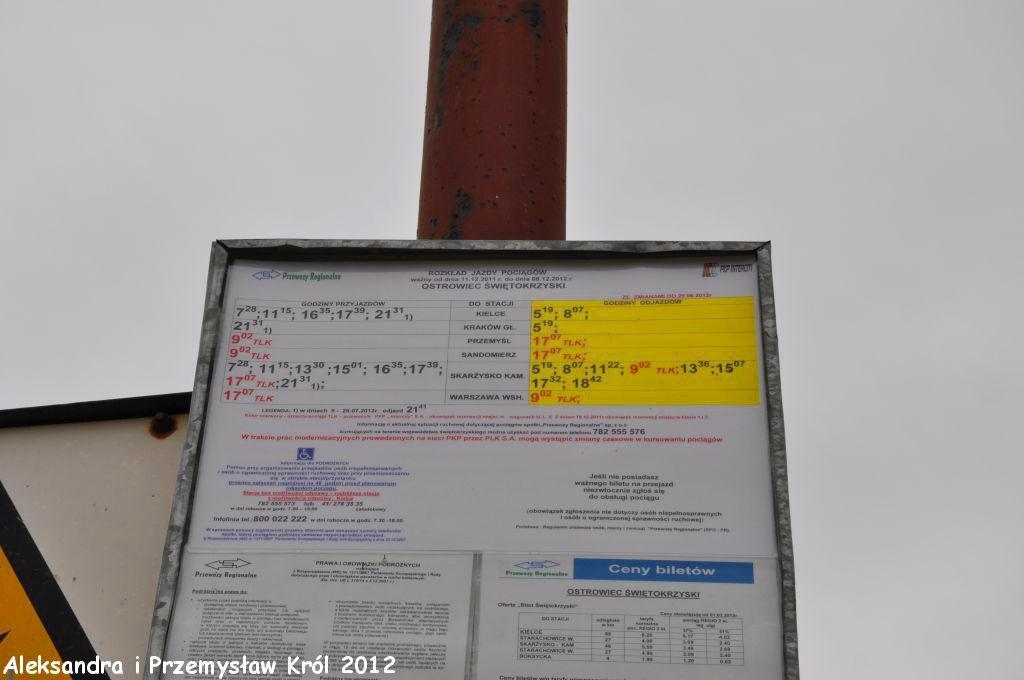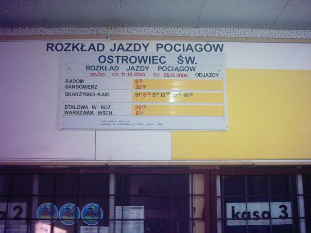 Rozkład jazdy wewnątrz budynku dworcowego. Od 10.12.2006 kursują tylko pociągi osobowe do Skarżyska. Nie kursują pociągi w kierunku Sandomierza.