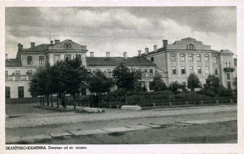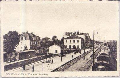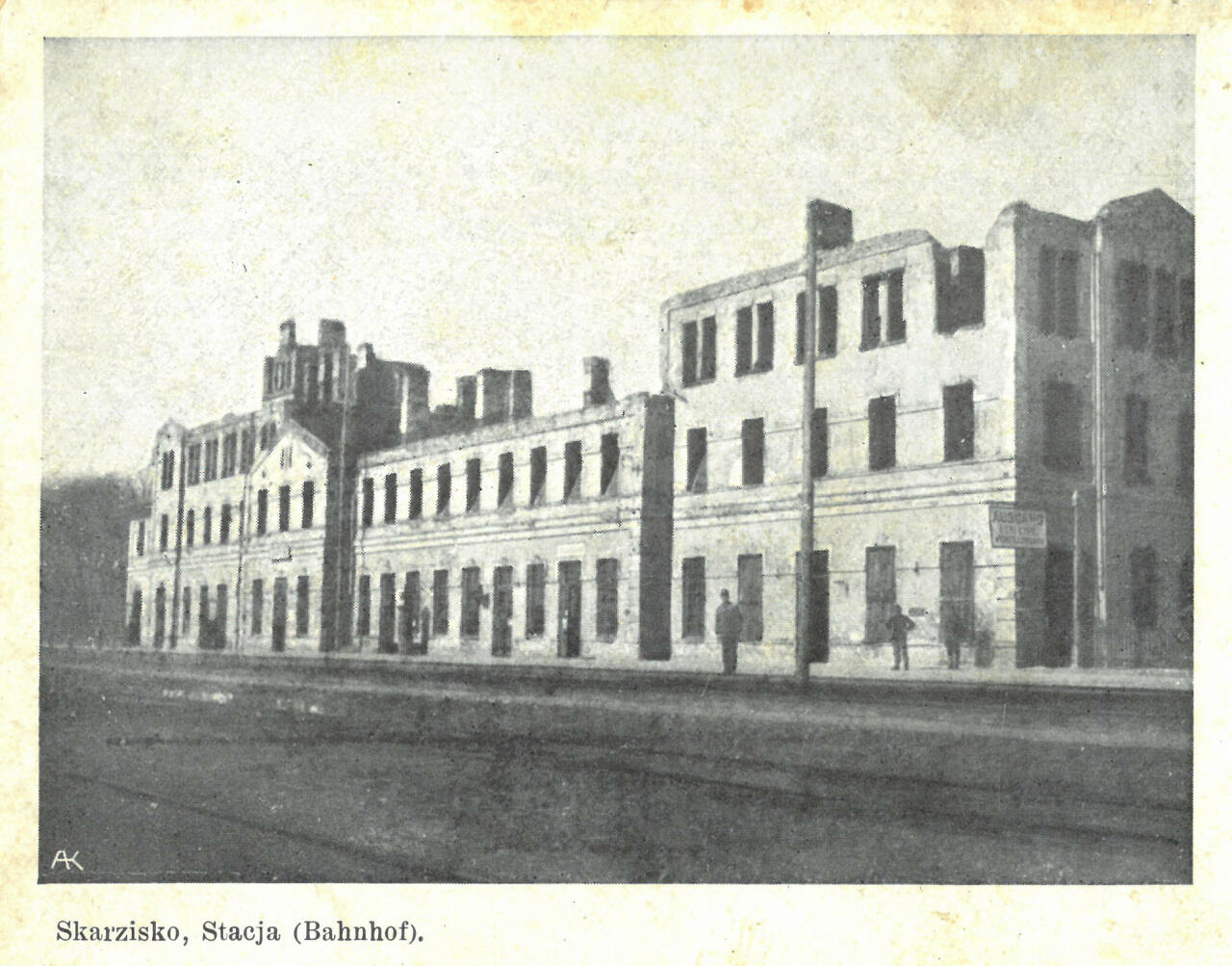 Wypalony w 1915 r. budynek dworcowy po przejściu frontu I wojny światowej. Widokówka wydana w 1916 r. nakładem skarżyskiej księgarni Rachmila Pfeffera.