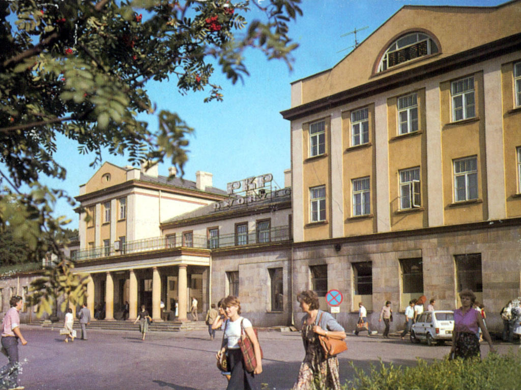 Stacja PKP Skarżysko-Kamienna. Widokówka z lat 80. XX wieku. Budynek dworcowy. Widok od strony Alei Niepodległości.