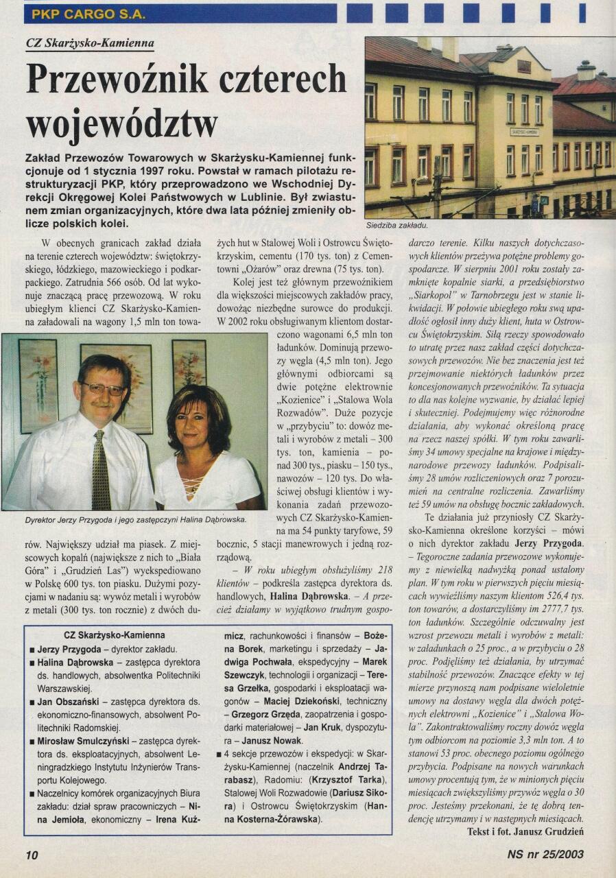 Skan artykułu z Nowych Sygnałów nr 25/03 o przewozach towarowych na stacji i w sąsiedztwie Skarżyska-Kamiennej.