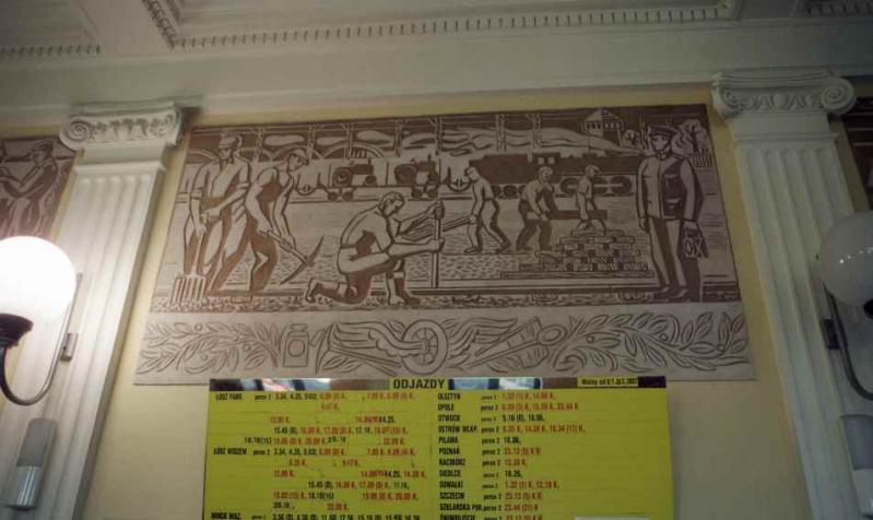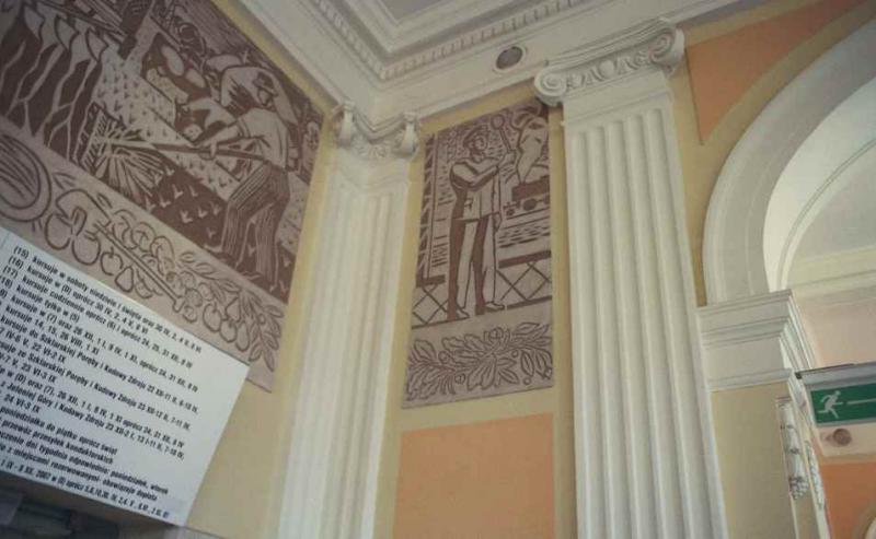 Jeden z rysunków ozdabiających halę dworca, dyżurny ruchu;