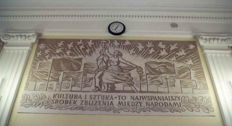 Wnętrze hali, zabytkowy napis; Czasy się zmieniają.