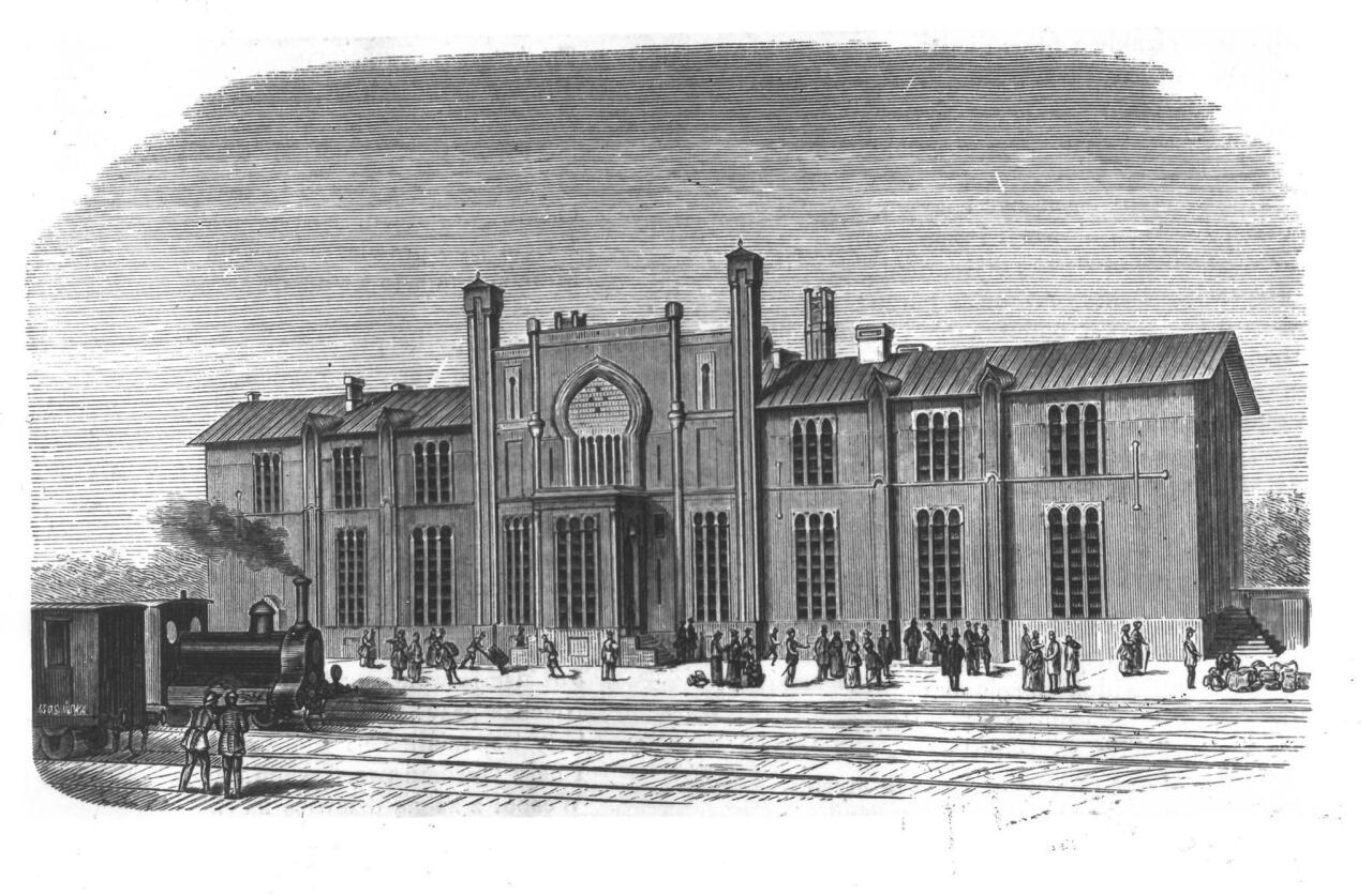 Grafika przedstawiająca pierwszy dworzec w Skierniewicach - w stylu mauretańskim. Ze zbiorów AP w Warszawie.