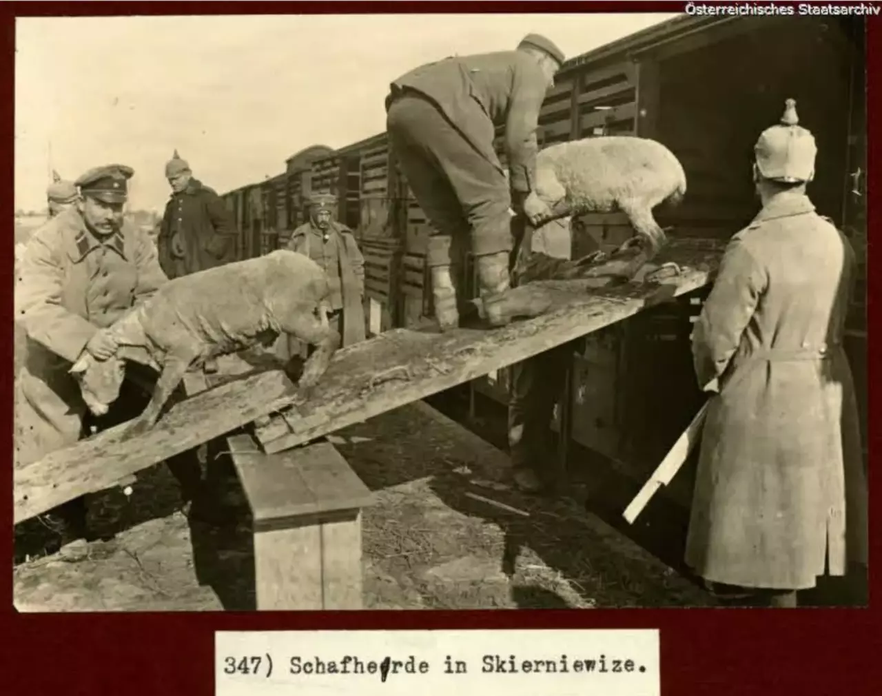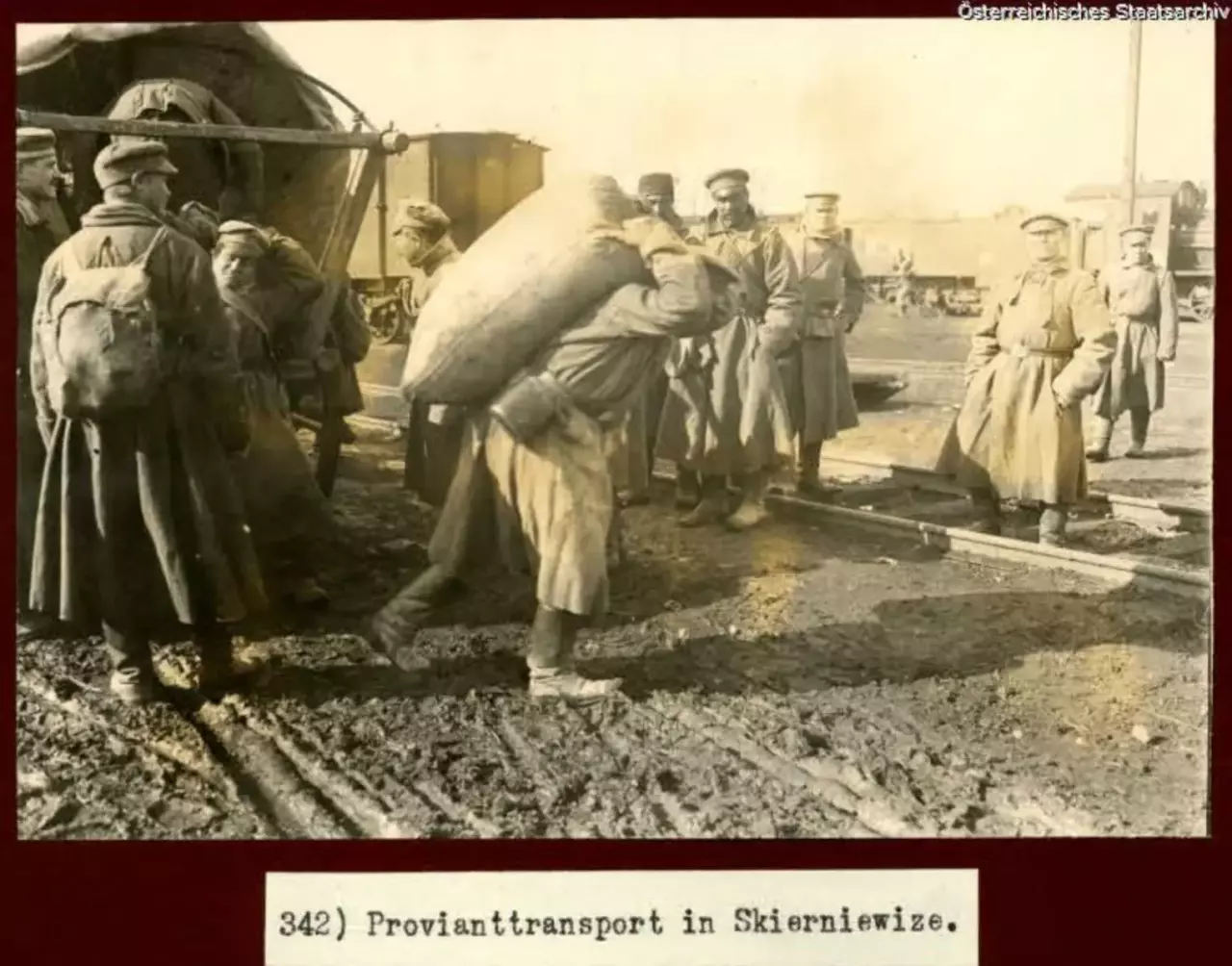 Wyładunek wagonów z prowiantem w Skierniewicach - wyładowują jeńcy rosyjscy pod okiem żołnierzy niemieckich i austriackich.
