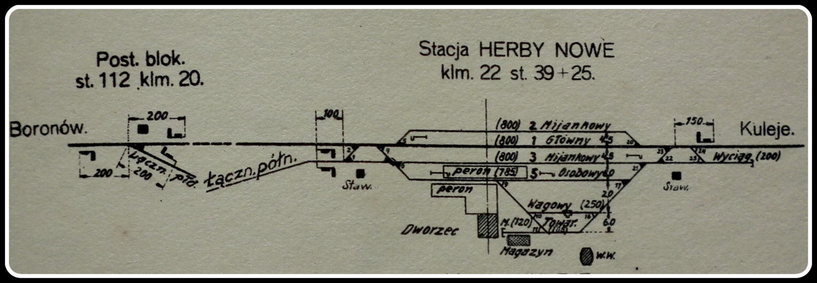 Plan stacji z 1926 roku, kilometraż linii Kalety -Podzamcze 22 km (+ post.Kalina).