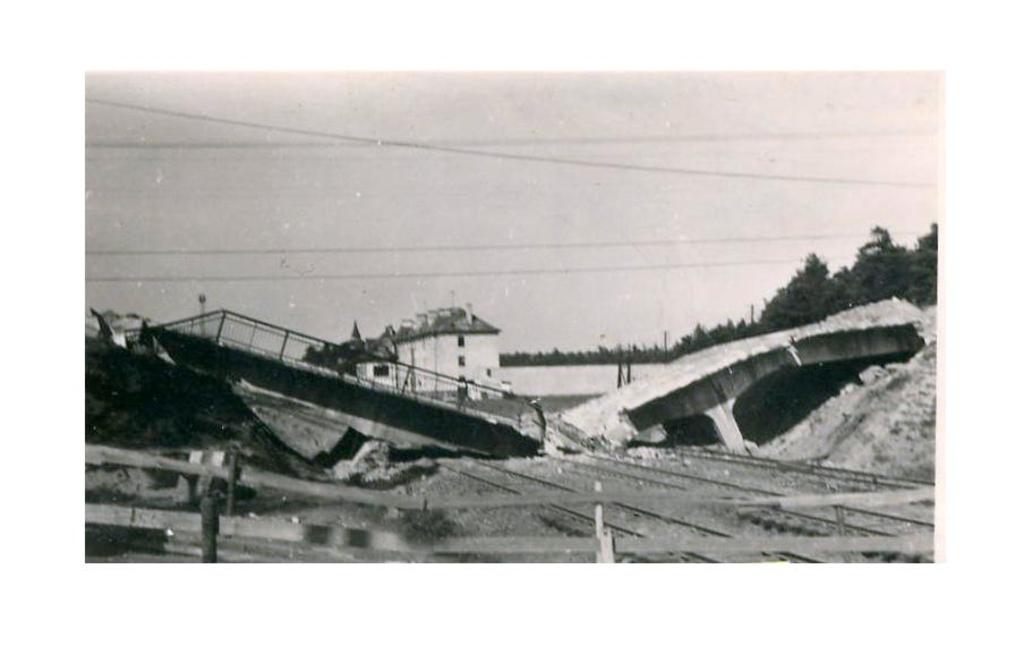 Wysadzony wiadukt, na drodze Lubliniec-Częstochowa. Za wiaduktem stacja Herby Nowe z widoczną nastawnią, budynkami mieszkalnymi i czubkiem wieży wodnej.