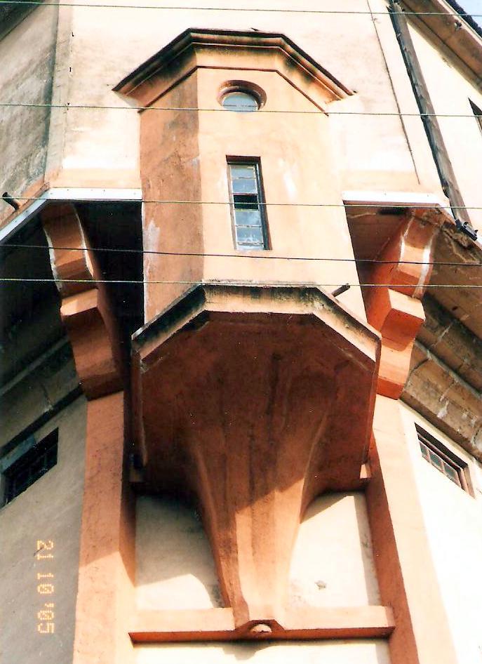 Herby Nowe. Dobudówka służąca do przejścia z trzonu wieży do części zbiornikowej, w prawym górnym narożniku, drugi wskaźnik poziomu wody w zbiornikach wieży wodnej.