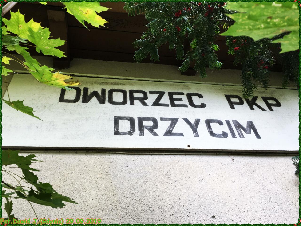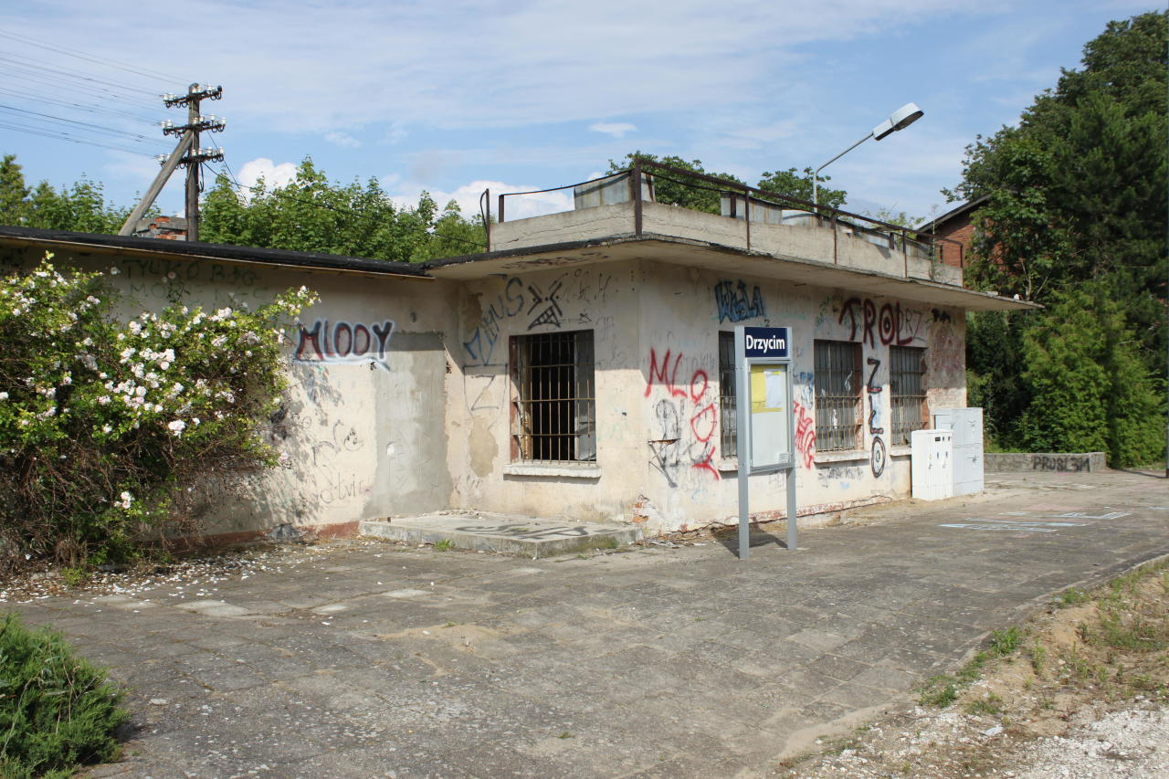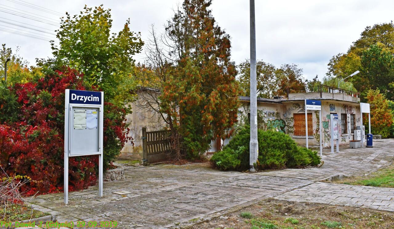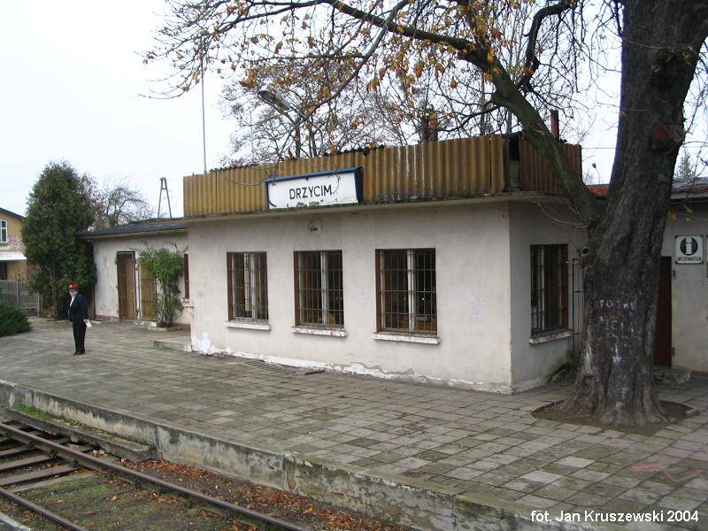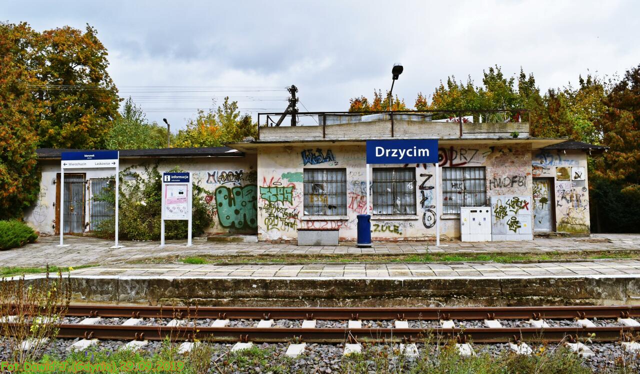 Zdewastowany budynek dworca w Drzycimiu. W wysuniętej części mieściła się nastawnia dysponująca. Na pierwszym planie puste miejsce po rozebranym torze dodatkowym. Widok od strony peronów; w lewo Wierzchucin, w prawo Laskowice Pomorskie.