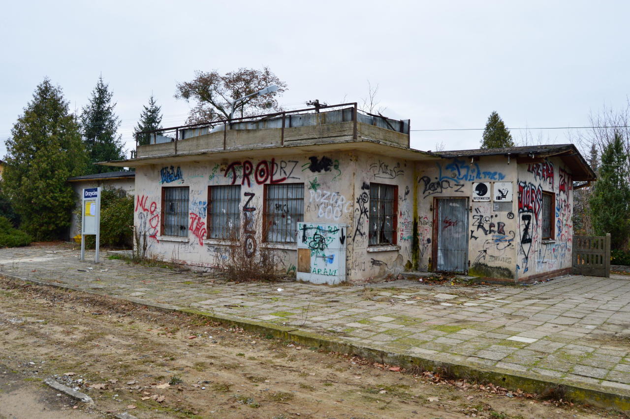 Zdewastowany budynek dworca w Drzycimiu. W wysuniętej części mieściła się nastawnia dysponująca. Widok od strony peronów; w lewo Wierzchucin, w prawo Laskowice Pomorskie.