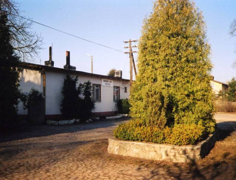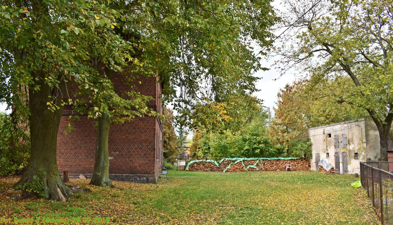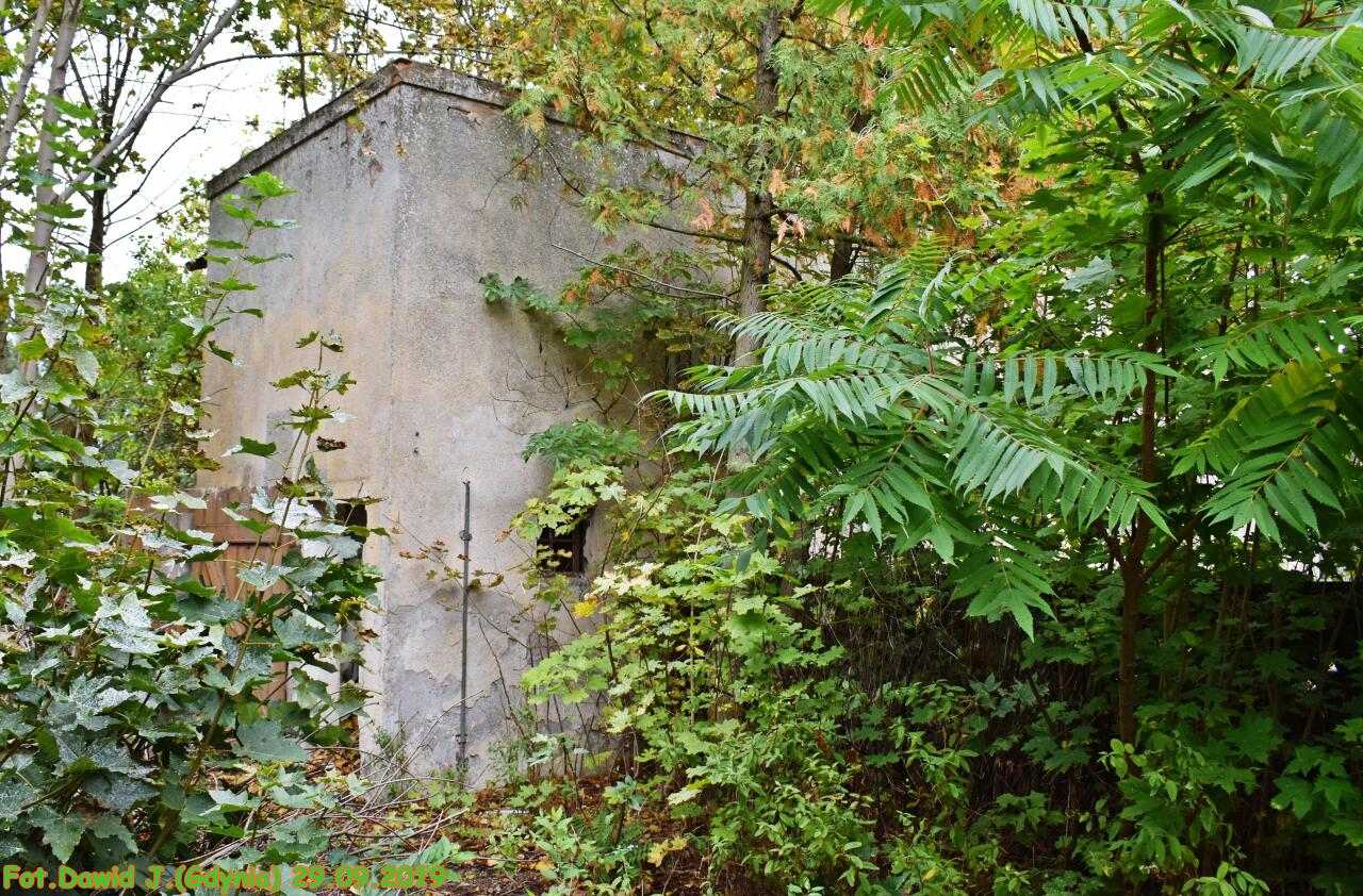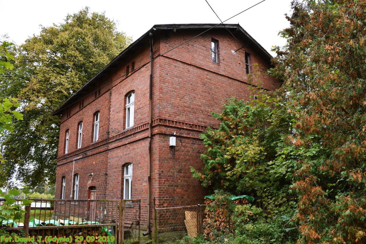 Kolejowy budynek mieszkalny (ul. Kolejowa 2) i pobliski budynek gospodarczy/budynek WC. Obiekty widoczne od strony podjazdu. Widok w kierunku Wierzchucina/Chojnic.