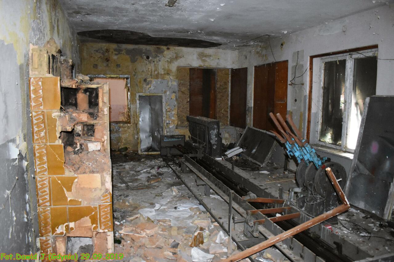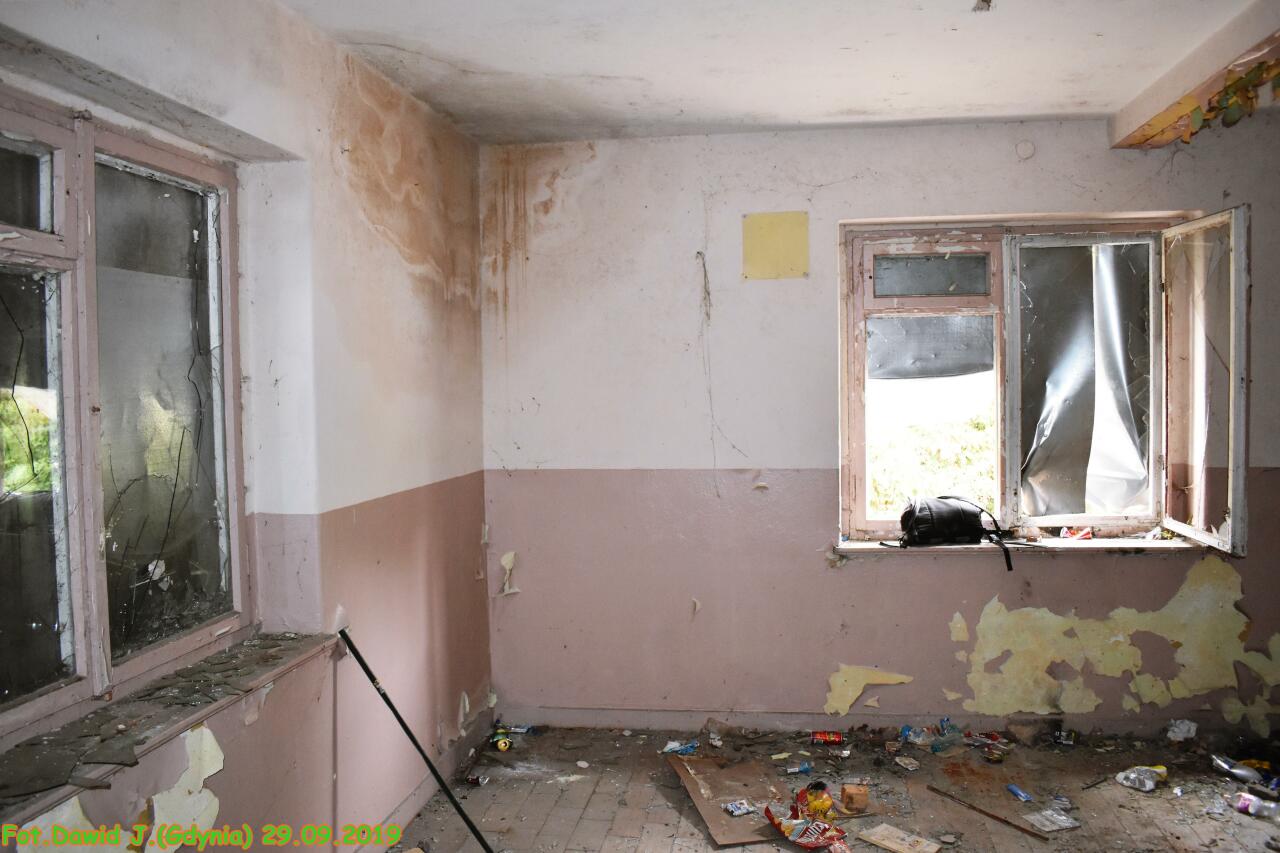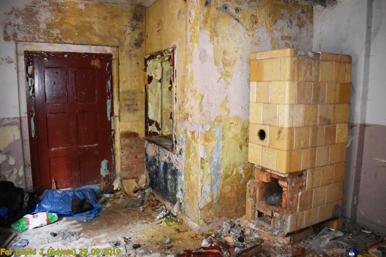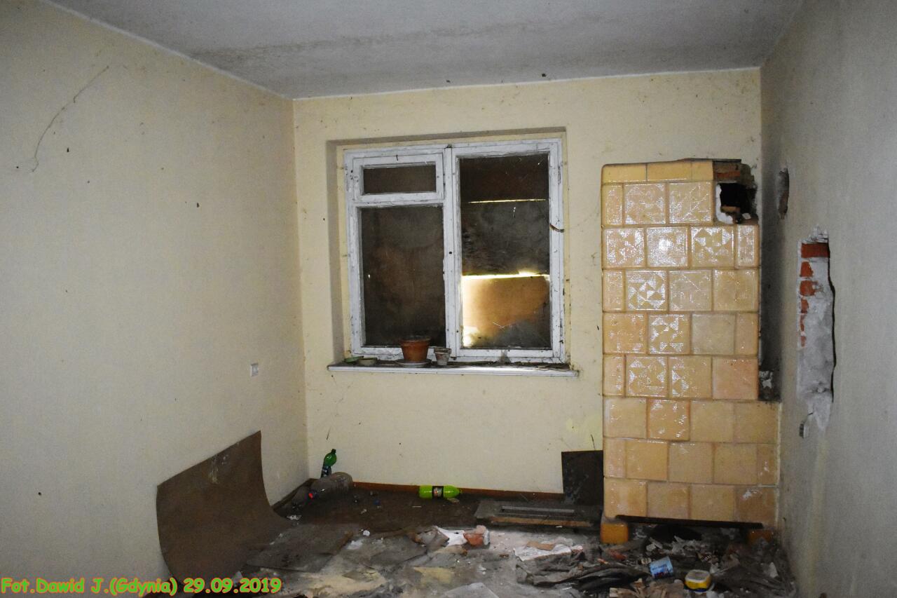 Wnętrze budynku dworcowego. Jedno z najprawdopodobniej dawnych pomieszczeń socjalnych, z pozoru przypominających przytulny pokoik. Wyrwa w ścianie to możliwa pozostałość po miejscu w którym był sejf. W budynku również znajduje się zejście do piwnicy.