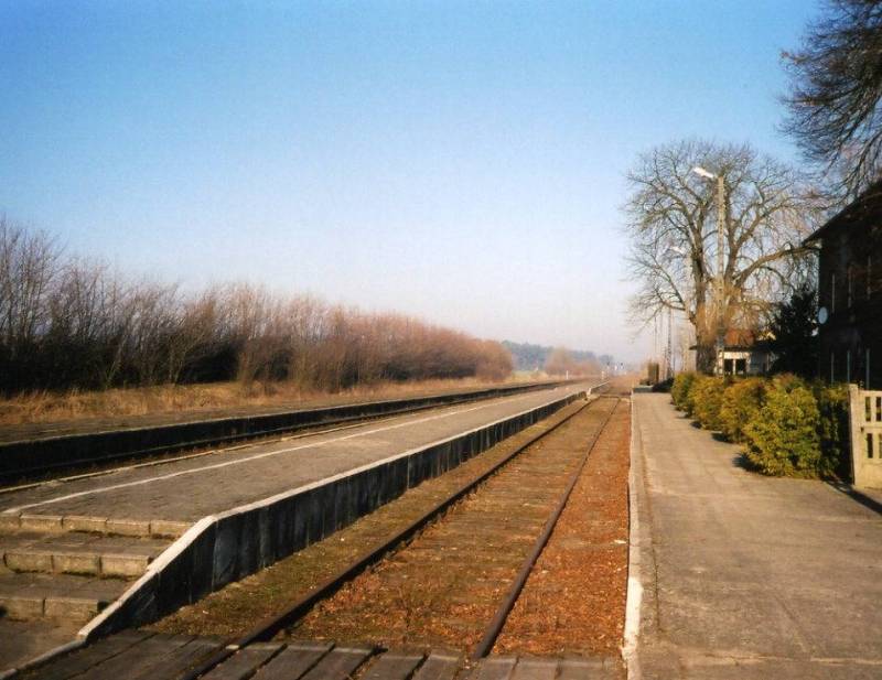 Widok na peron i w kierunku Laskowic Pomorskich/Działdowa. Kolejowy budynek mieszkalny (ul. Kolejowa 23) znajduje się po lewej stronie.