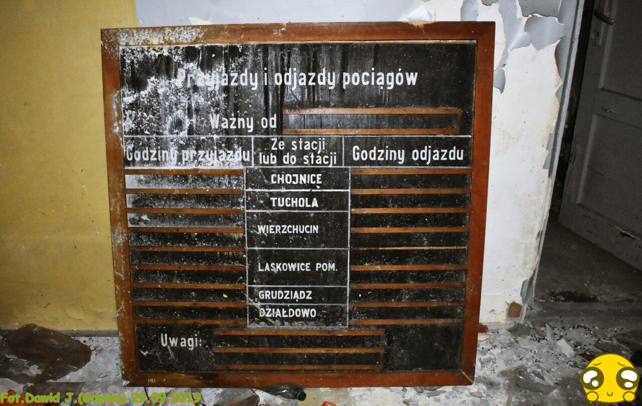 Wnętrze budynku dworcowego. Dawne pomieszczenie pracownika, który obsługiwał kasę biletową. Bardzo istotny detal schowany w tym pomieszczeniu, to ta tablica, która na pierwszy rzut oka, dla osoby zupełnie nie zorientowanej w temacie może mało mówić. Na tej tablicy prawie 20 lat temu prezentowano przyjazdy i odjazdy z czasów zjednoczonego PKP, gdy uruchamiane pociągi były nawet w relacji Chojnice-Działdowo. Podobne tablice występowały na wielu pomorskich dworcach, w galeriach na stronie są zawarte zdjęcia podobnych, takich tablic na stacjach: Sierakowice, Żelistrzewo lub Somonino. Prawdziwy rarytas, mam nadzieje, że nie zostanie zniszczona i trafi wkrótce w dobre ręce.