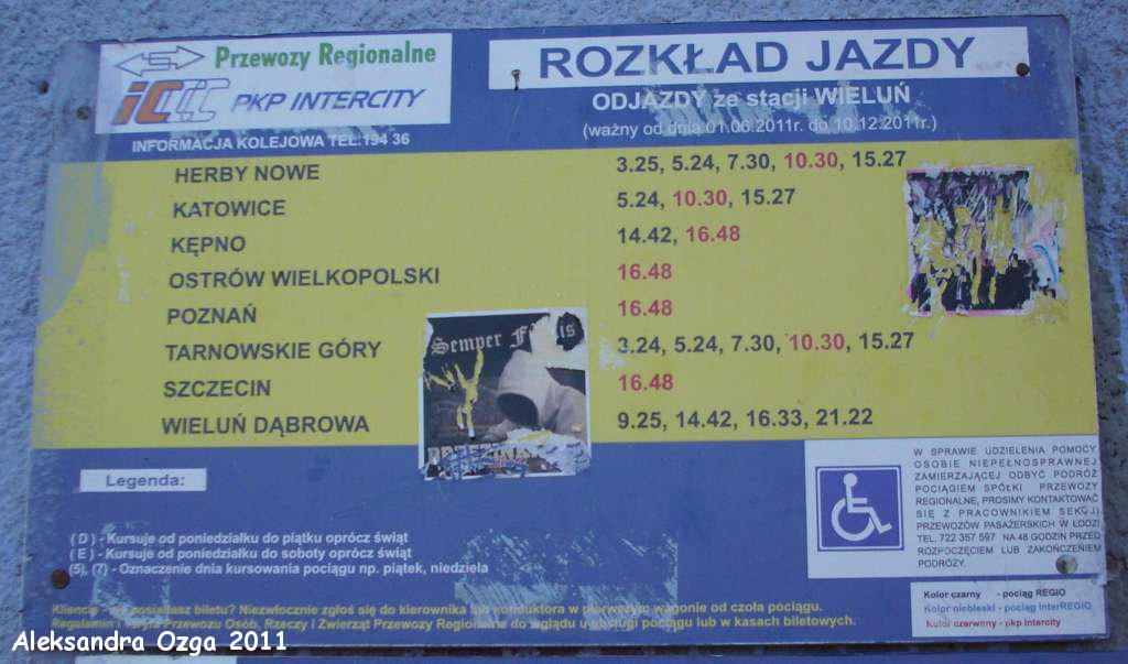 Rozkład jazdy na stacji we Wieluniu. Jak widać zatrzymują się tutaj pociągi pospieszne.