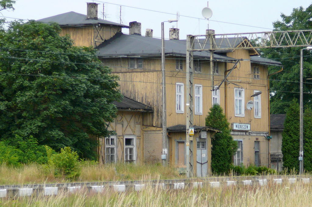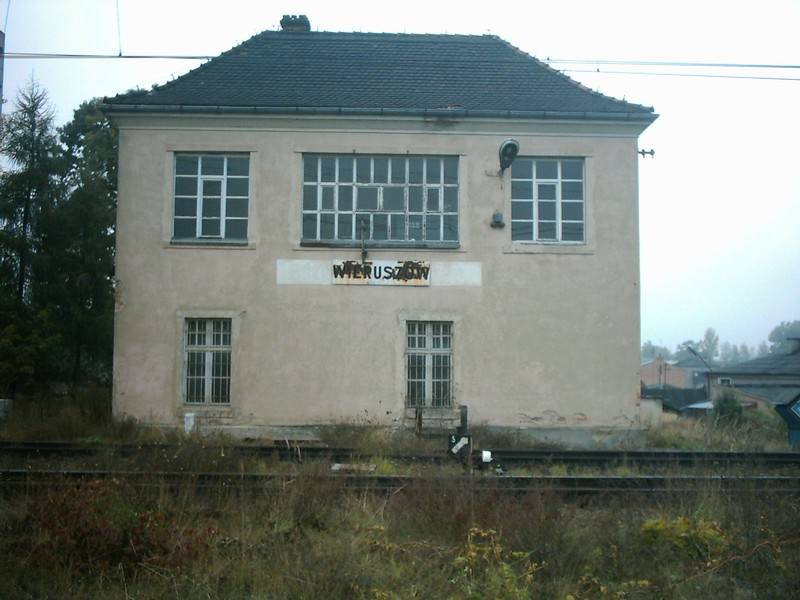 Zniszczony budynek stacji kolejowej w Wieruszowie. Nic dodać, nic ująć, popada w ruinę. Widok od strony drogi.