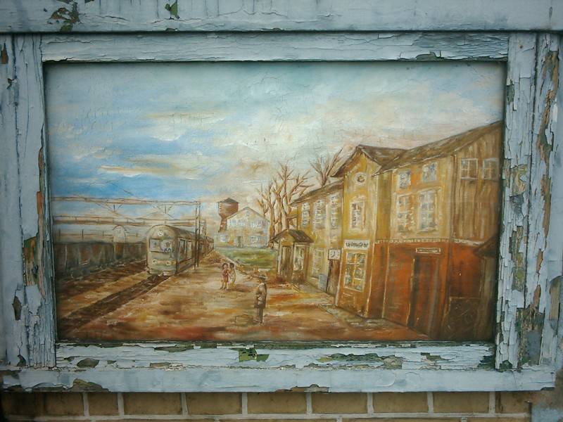 Taki obraz wisi na zdewastowanym wieruszowskim dworcu…Był zapewne malowany dawno temu, bo tor na którym stoi ten szynobus jest pozbawiony szyn…