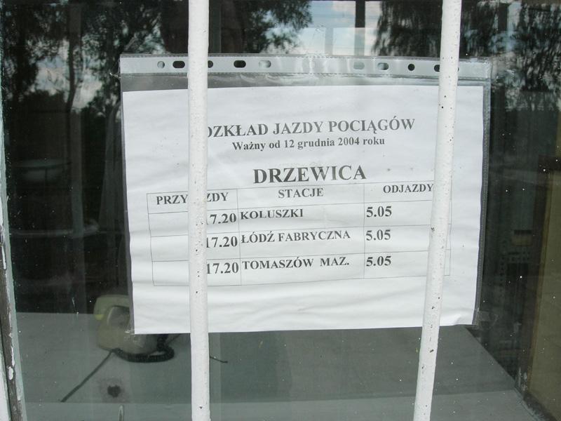 Stacja PKP Drzewica. Przez okno budynku dworcowego można skorzystać z rozkładu jazdy pociągów. Kursuje jeden pociąg pospieszny WIENIAWSKI (Lublin - Poznań) oraz osobowy do Koluszek lub Łodzi Fabrycznej. Jednak poniższe informacje są już bardzo wyblakłe.