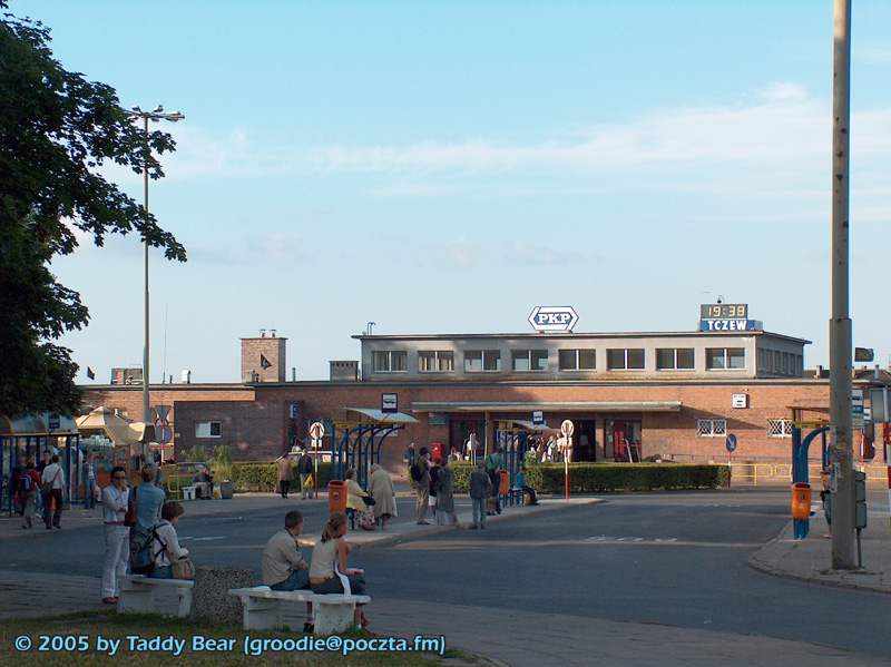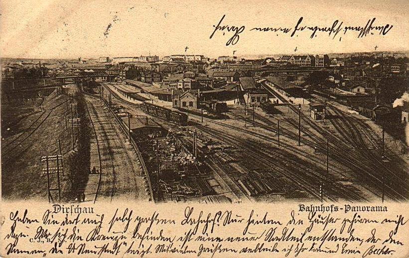 Widok na budynek dworca w kierunku południowo-zachodnim; w lewo Pelpin, Malbork, w prawo Pszczółki, Starogard Gdański.