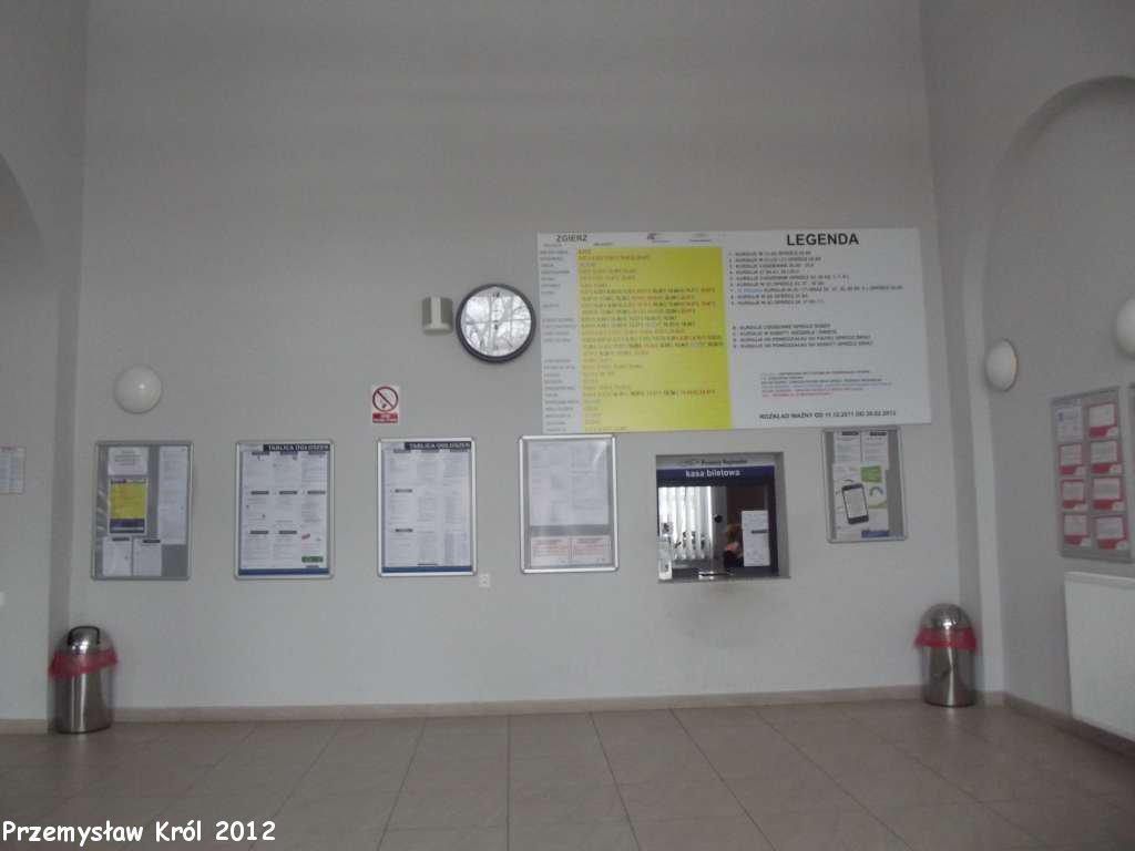 Kasy biletowe wewnątrz budynku stacyjnego.