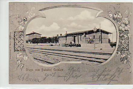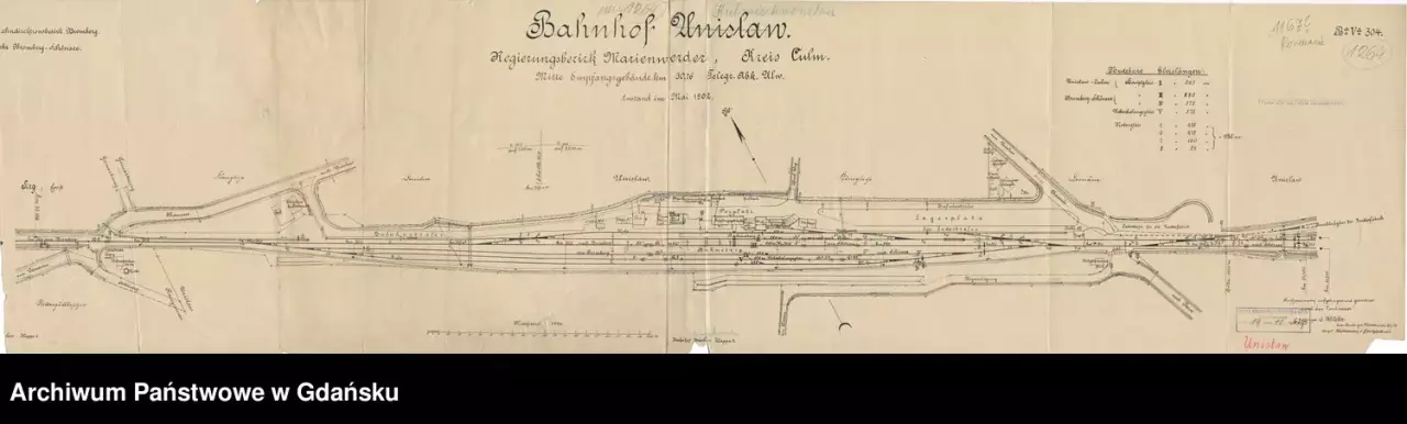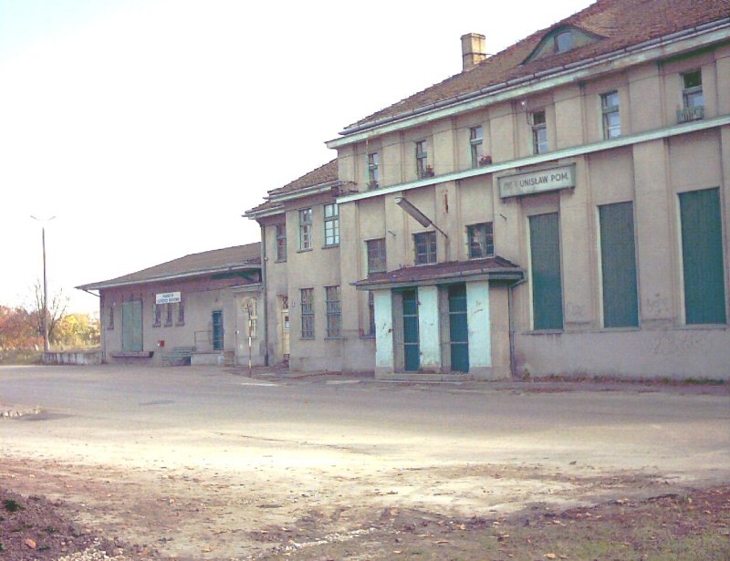 Eisenbahndirektionsbezirk Bromberg. Strecke: Bromberg - Schönsee. Bahnhof Unislaw. Regierungsbezirk Marienwerder, Kreis Culm. Mitte Empfangsgebäude km 30,76 Telegr. Abk. Ulw. Zustand im Mai 1902.