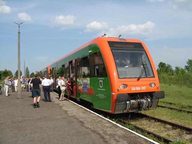 SA106-017 jako pociąg nadzwyczajny (promocyjny) nr 11623 relacji Toruń Wsch. – Bydgoszcz Gł. podczas postoju na stacji Unisław Pomorski. Być może szynobus wkrótce pojawi się jako pociąg rozkładowy.