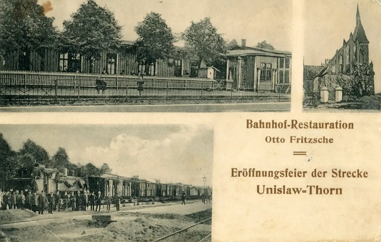 Pocztówka upamiętniająca otwarcie linii Unisław - Toruń oraz reklamująca restaurację dworcową Ottona Fritzsche. W górnym polu dworzec od strony peronów: w lewo Bydgoszcz, Toruń, w prawo Chełmża, Chełmno. U dołu perony w widoku spod budynku dworca: w prawo Bydgoszcz, Toruń, w lewo Chełmża, Chełmno.