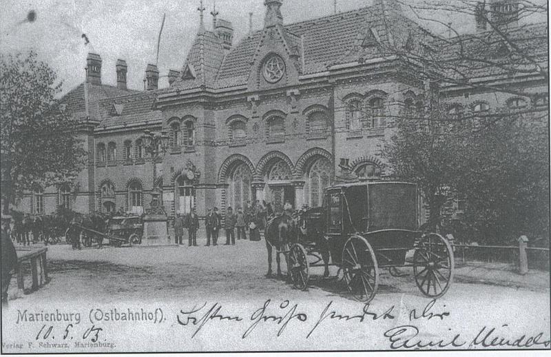 Dworzec w Malborku. Dorożki konne przed dworcem Kolei Wschodniej.