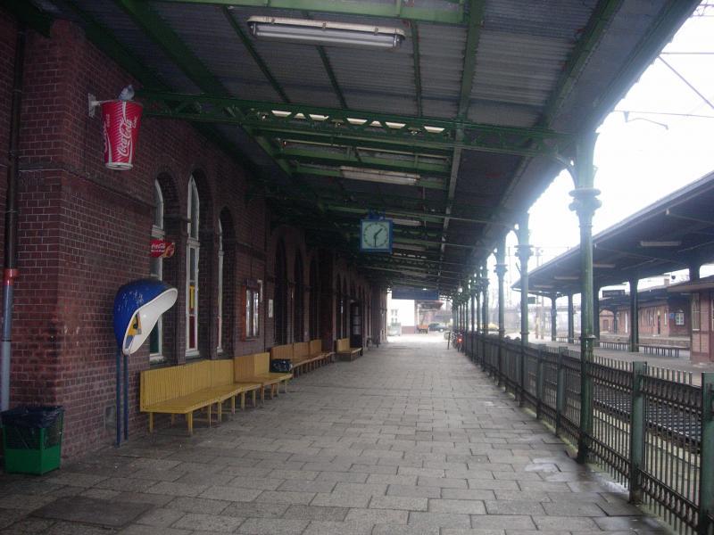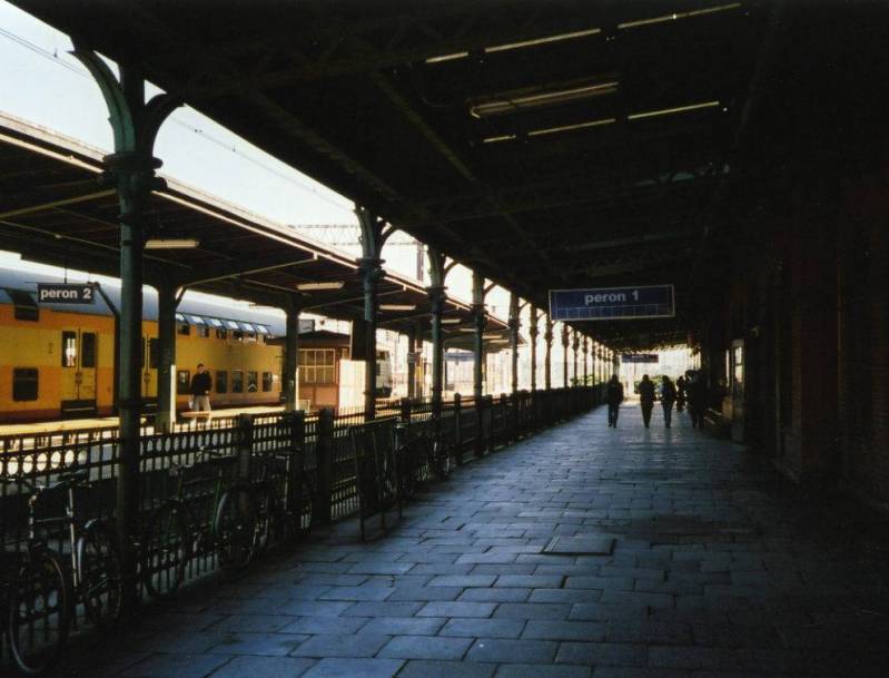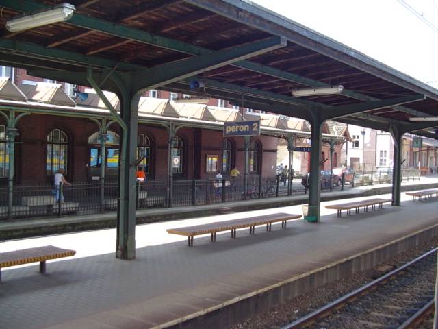 Pod wiatą peronu nr 1, która jest elementem gmachu dworca kolejowego.
